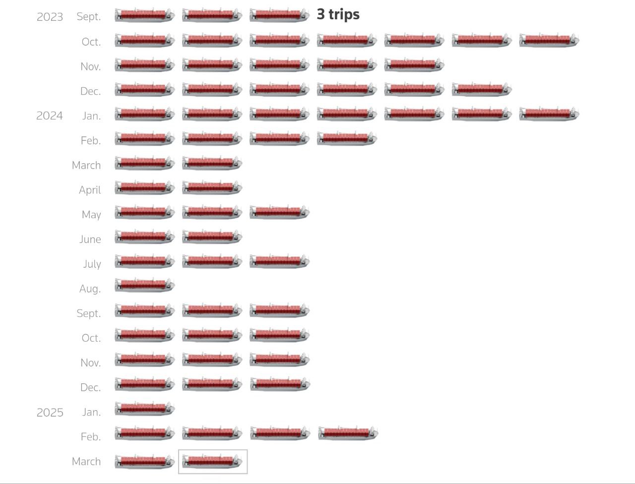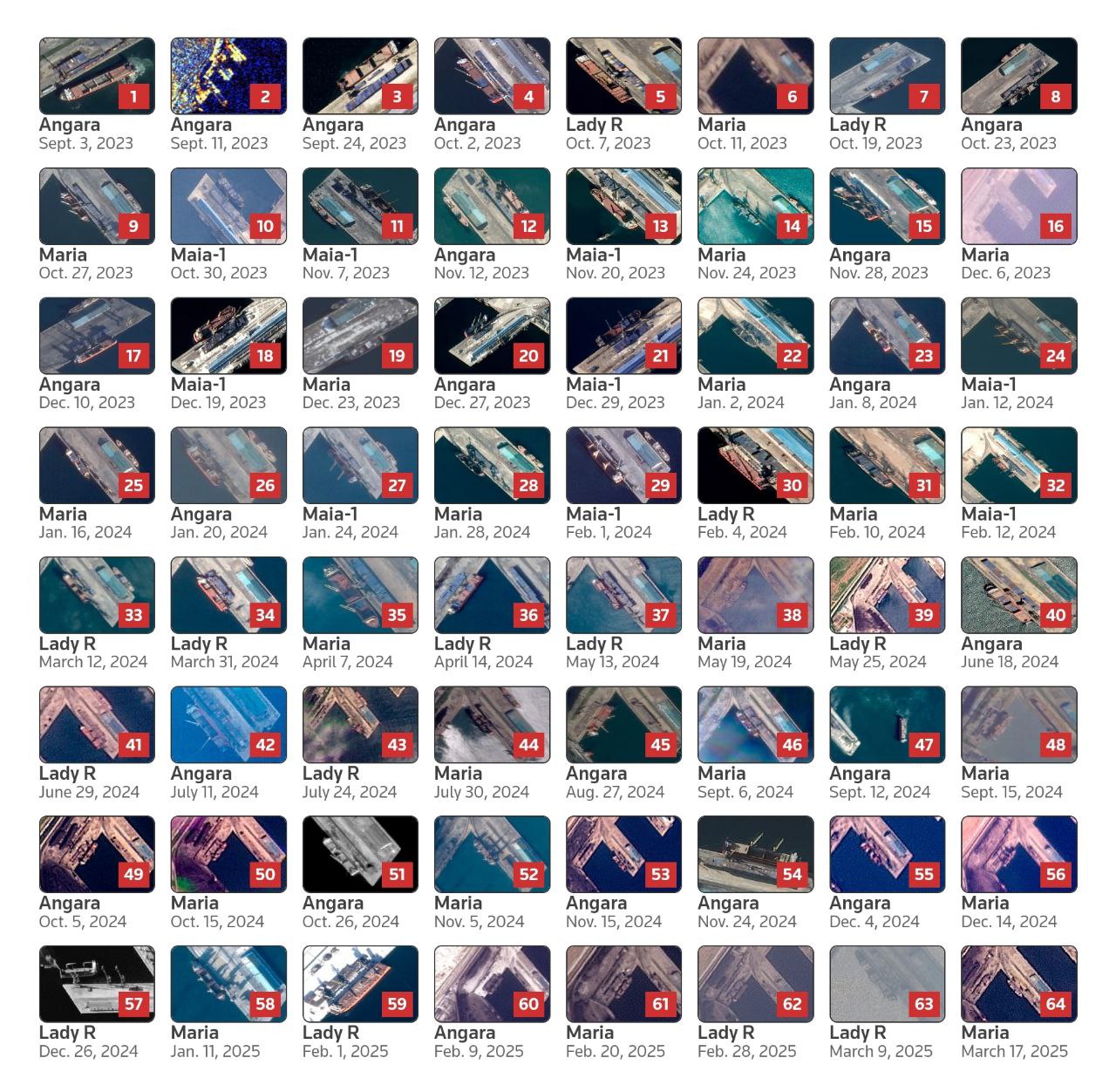 К делу буржуи подошли предельно основательно: для начала была собрана информация о средствах доставки, каковыми оказались четыре контейнеровоза, курсирующие между северокорейским портом Раджин и нашими дальневосточными портами Восточный и Дунай. Всего суда совершили 64 рейса; наибольшей интенсивности поставки достигли в январе 2024-го, когда в Россию было доставлено семь партий боеприпасов. После этого интенсивность Раджинского морского экспресса опустилась до четырех рейсов в месяц и держалась на этом уровне до марта текущего года.