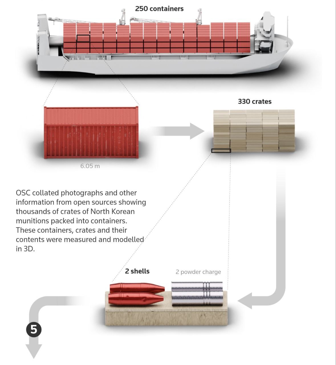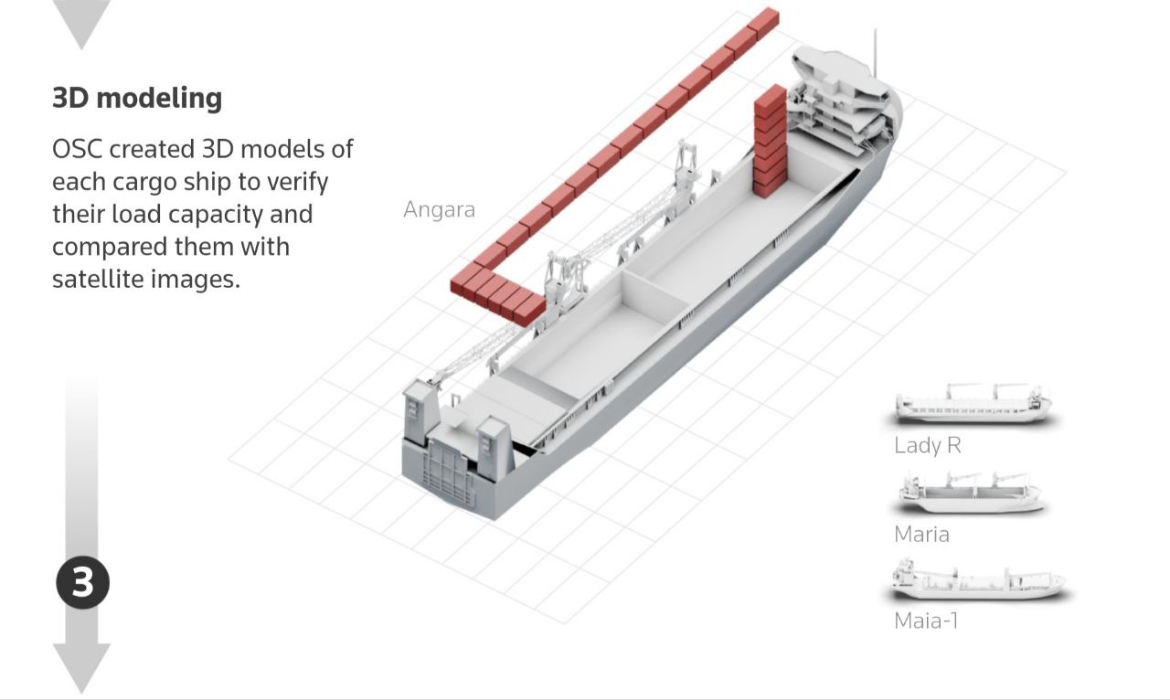 Чтобы понять, сколько контейнеров помешается в каждый из четырех наших транспортов, OSC провело 3D-моделирование кораблей, раздобыв для этого чертежи судов. Моделирование показало, что всеми рейсами могло быть перевезено 15 809 контейнеров.