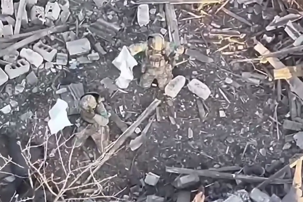 Украинские солдаты вылезли из разбомбленного укрытия с белыми тряпками и дали понять оператору БПЛА, что сдаются.