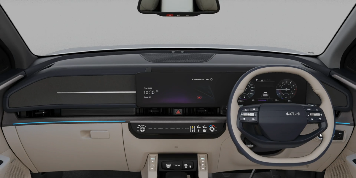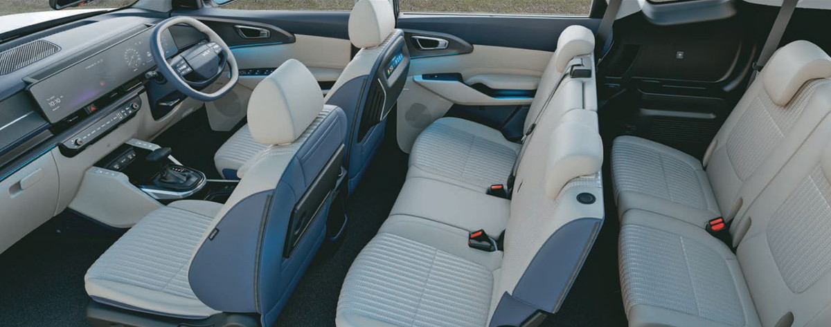 Интерьер новинки тоже получил отличия от «просто» Kia Carens. Модель, как и «донор», является трёхрядной и рассчитана либо на шестерых, либо на семерых седоков. Внутри можно увидеть «приплюснутое» с двух сторон двухспицевое рулевое колесо (как у кроссовера Syros), на передней панели находится большое горизонтальное табло диагональю 22,6 дюйма, которое объединяет в себе как виртуальную приборку (на 10,25 дюйма), так и центральный тачскрин информационно-развлекательной системы (тоже на 10,25 дюйма).