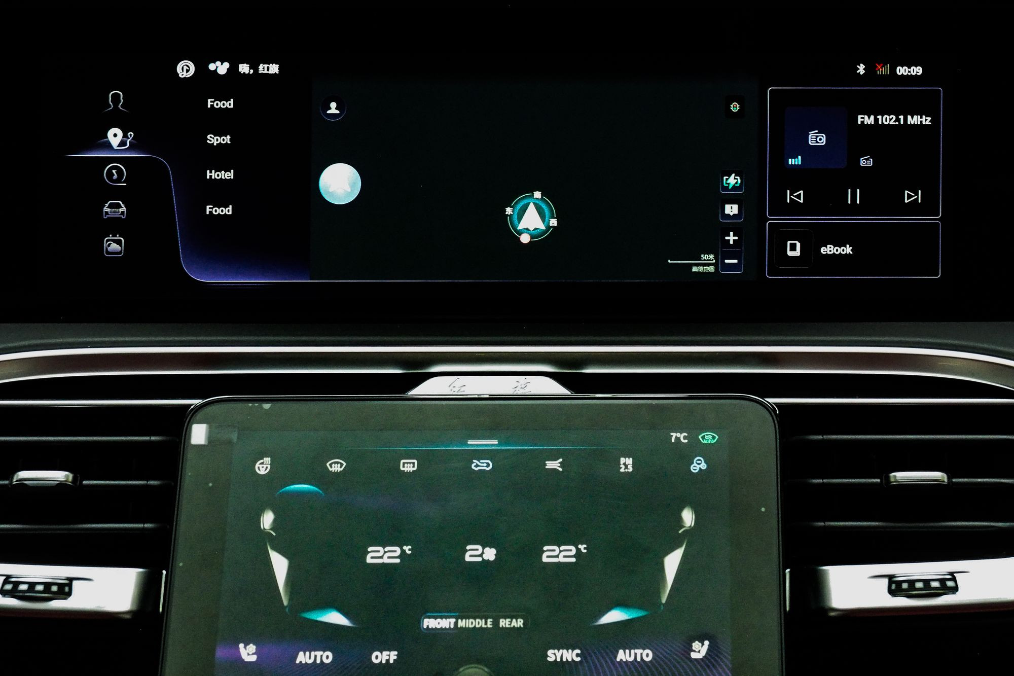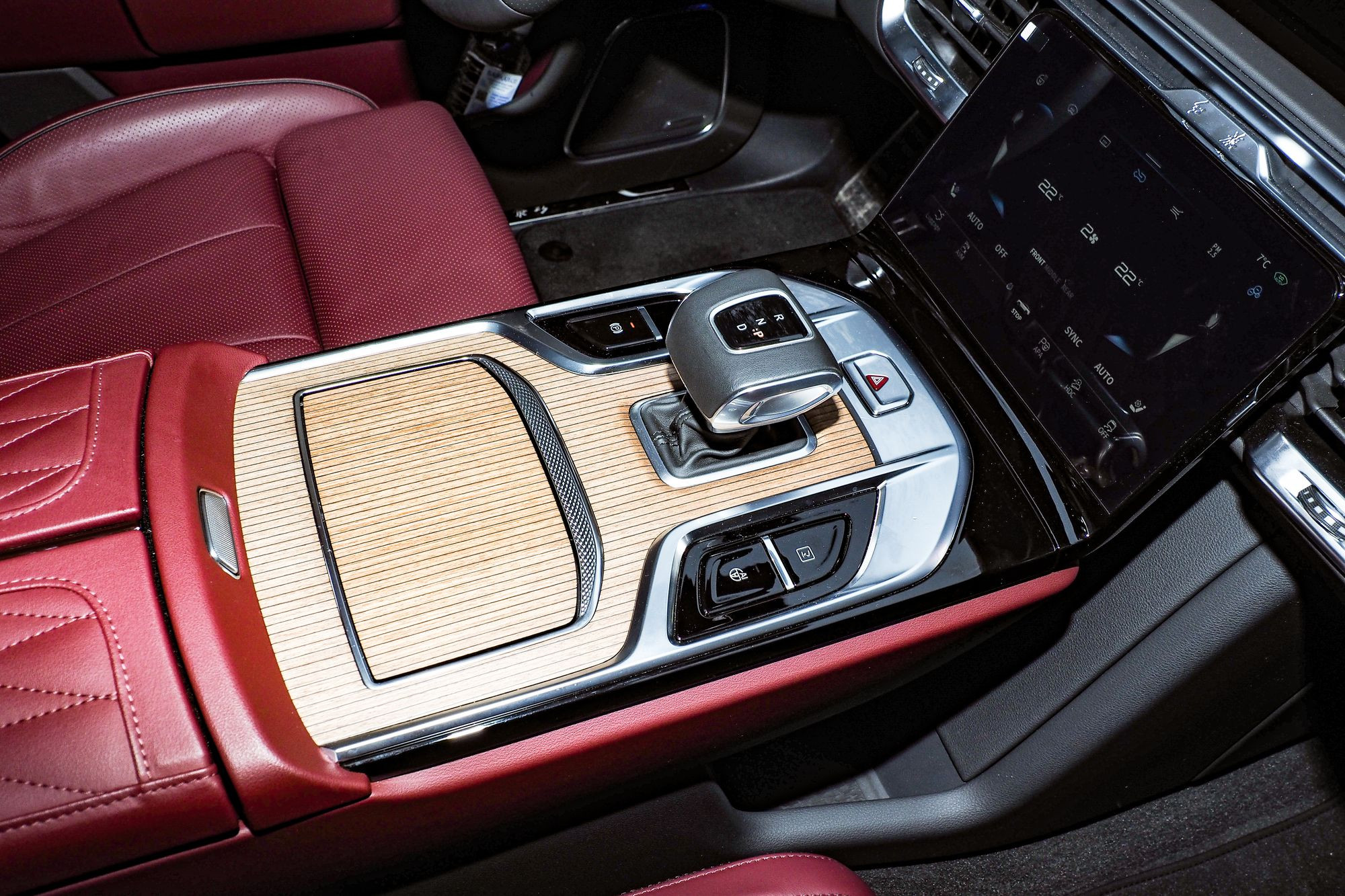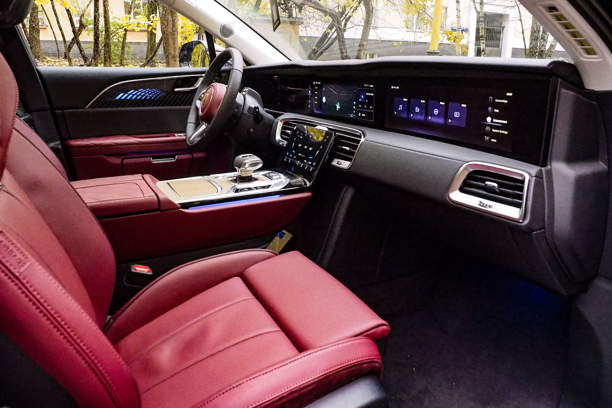 Тем не менее, на первый взгляд, салон Е-HS9 Deluxe кажется простоватым. Вот салон, отделанный бежевой кожей Nappa, сразу воспринимается как роскошный, а тут и кожа грубовата, да и многие мягкие отделочные материалы на вид кажутся жесткими. Мы уже привыкли к термину «софт-лук», то есть жесткий пластик, который выглядит как как мягкий, а тут прямо «хард-лук» какой-то… Положение не спасают даже четыре (!) дисплея, украшающие переднюю панель: левый заменяет комбинацию приборов и экран бортового компьютера, верхний средний отвечает за управление головным устройством и многие настраиваемые функции, нижний средний управляет климатом (климат-контроль в этом автомобиле, кстати, четырехзонный, и у каждого из пассажиров второго ряда имеется возможность настроить собственный микроклимат, для чего в их распоряжении есть отдельный сенсорный дисплей), правый предоставлен переднему пассажиру в качестве инструмента для развлечений.