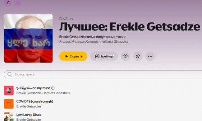 При этом Гецадзе публикует свои треки на российских площадках, в частности, на Яндексе. На обложке одной из них изображен президент РФ Владимир Путин с надписью «Ты дурак» на грузинском языке.