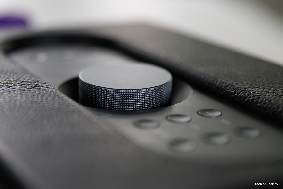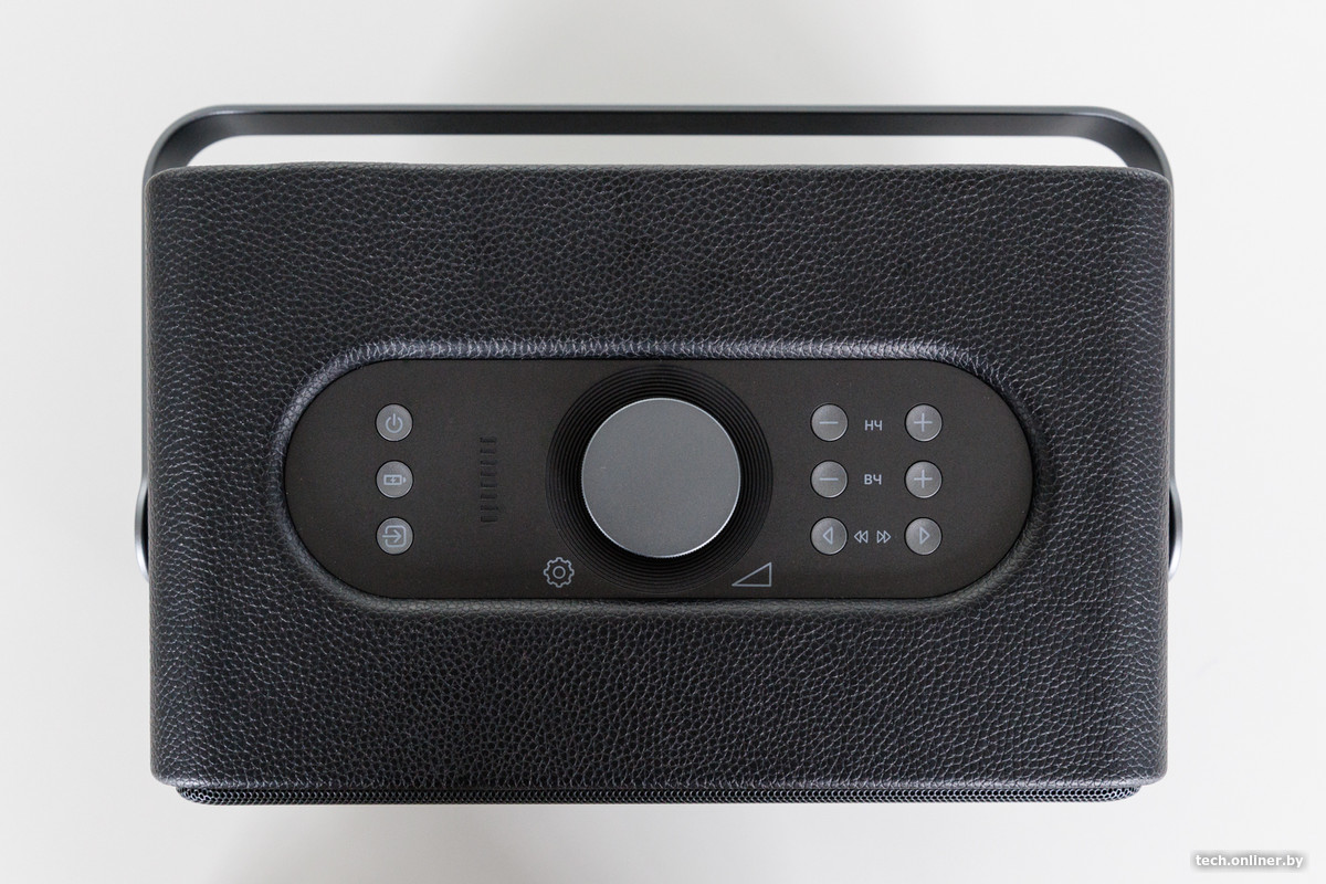 Внутри — двухполосная система с пассивным излучателем, частотный диапазон в 70—20 000 Гц и мощность звука в 80 Вт. Нижние и верхние частоты можно настраивать с помощью физических кнопок, громкость — за счет поворотного регулятора. Получается эдакий физический эквалайзер, полезный в особо придирчивых жанрах.