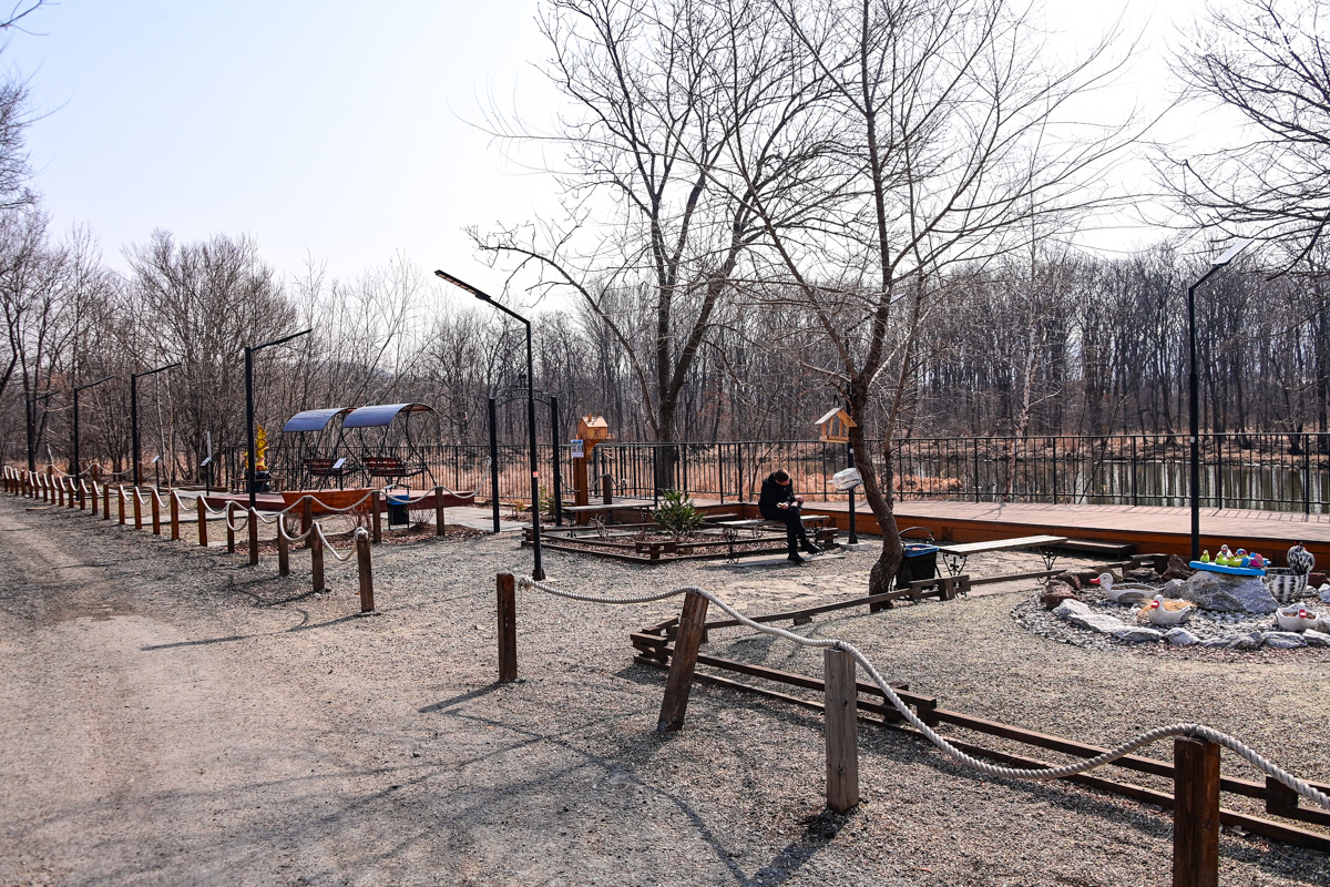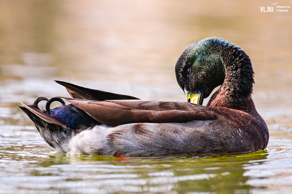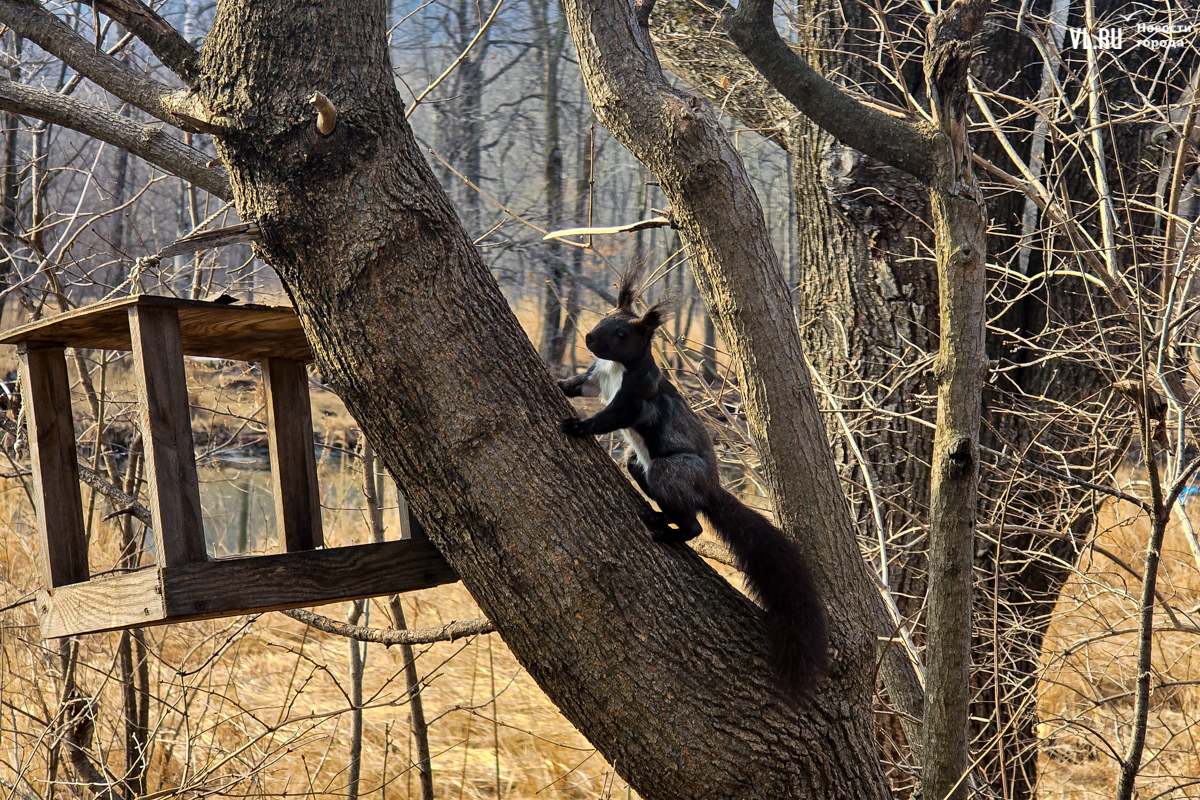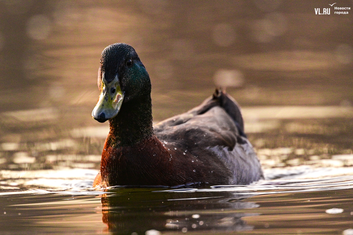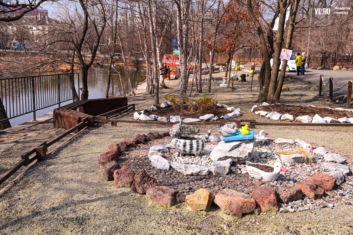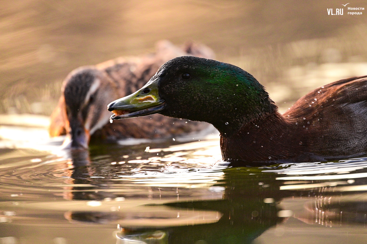 Соседствуют с мандаринками обычные кряквы – одни из самых распространённых уток в России. Селезни с зелёными головами и белой каймой на шее тоже ищут себе пару. По берегу разгуливают местные коты, а по деревьям скачут деловитые белки.