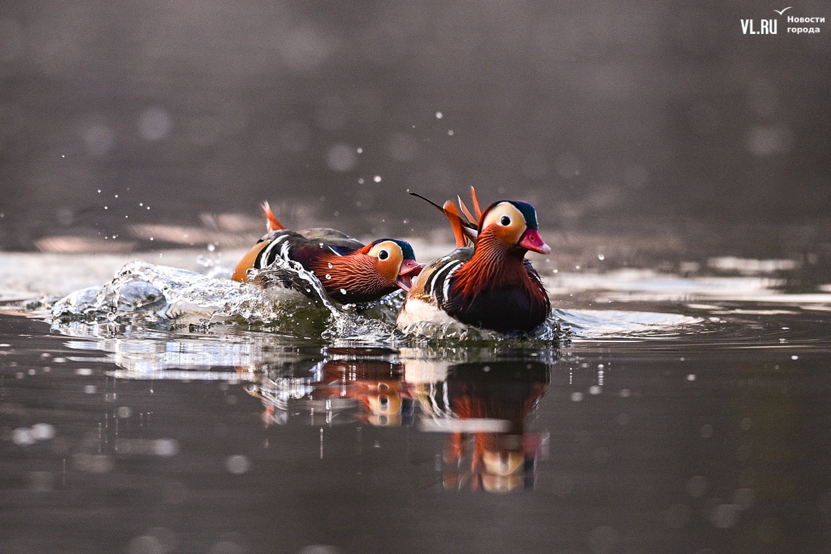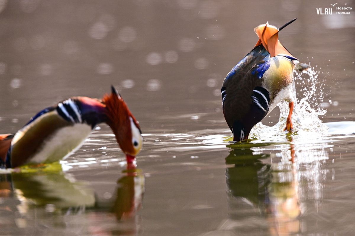 Правда, оперение привлекательно только у самцов и то на короткое время. Самки серенькие, их непросто отличить от любых других уток. Но, видимо, не за внешность самцы-«мандарины» выбирают себе пару, причём на всю жизнь. Эти птицы моногамны, и прямо сейчас у них активный брачный период – селезни сражаются друг с другом за благосклонность своей дамы.