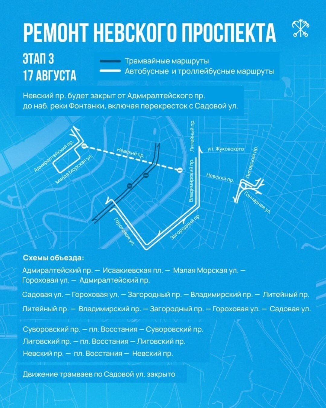Напомним, ремонт Невского проспекта разбили на этапы, чтобы снизить неудобства для жителей. С 15 по 20 августа работы идут на участке от Адмиралтейского до Садовой, с 17 по 20 августа — до Фонтанки, а с 18 по 20 августа — до Литейного. В центре Петербурга из-за этого возникли пробки на большинстве улиц, прилегающих к проспекту. Ночью 15 августа был перекрыт отрезок от Адмиралтейского до Садовой.