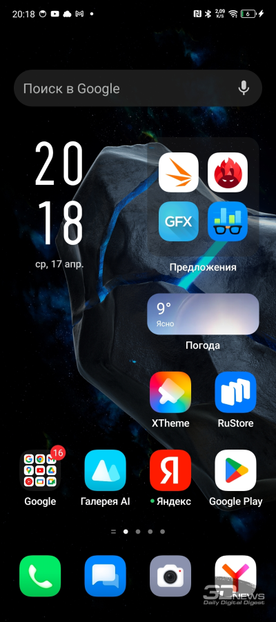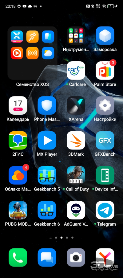 Это по большей части уже хорошо знакомая оболочка XOS: с крупными папками, обычной для всех смартфонов на Android схемой управления, окошком, подражающим Dynamic Island от Apple, и большим числом предустановленных приложений. Самое главное обновление – ИИ-функции… которые не работают в России. В остальном система функционирует быстро и без сбоев, дизайн может вызывать вопросы, но ничего критичного – просто дело вкуса. В памяти смартфона оболочка занимает почти 16 Гбайт. Обещают два года обновлений системы и три года обновлений безопасности.