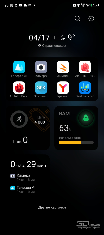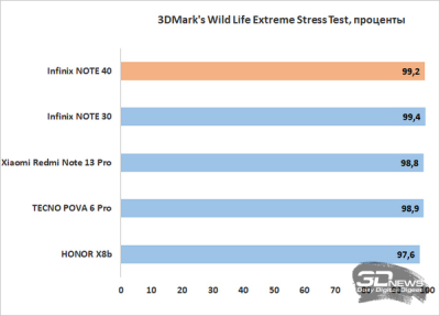 С охлаждением никаких проблем у смартфона нет, к перегреву разгон не приводит. Ресурсные тесты, как обычно в случае с Helio G99, не фиксируют падения частоты. Гаджет разогревается минимально.