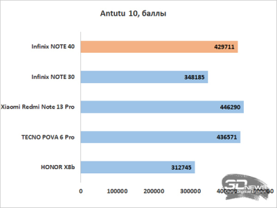 Подтверждается это нашим тестом с воспроизведением Full HD-видео на максимальной яркости с включенным Wi-Fi. Infinix NOTE 40 продержался чуть более 10 часов, что для смартфона с экраном на органических светодиодах результат слабый. Можно списывать это опять же на сырую предсерийную прошивку, но заявлять об этом с уверенностью я не могу.