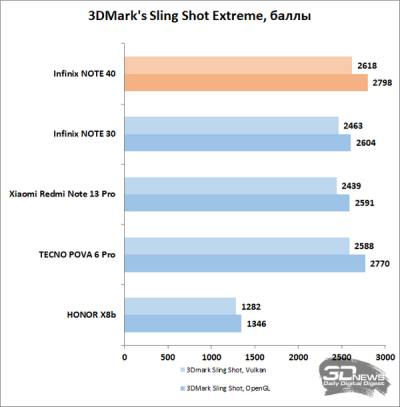 В Infinix NOTE 40 установлен чип MediaTek Helio G99 Ultimate – тот же, что и на NOTE 40 Pro: модифицированная версия уже классической платформы с программным усилением процессов, связанных с нейросетями, – но в России, как я уже обозначил выше, в любом случае не работающих. Так что в принципе можно сказать, что здесь установлена обычная Helio G99, но чуть разогнанная.