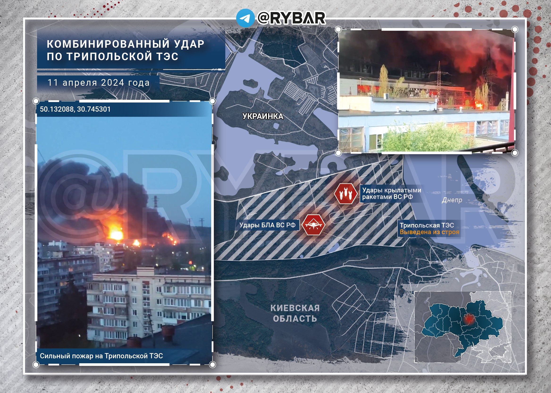 Утром 11 апреля по Трипольской ТЭС в Киевской области был нанесен комбинированный удар БЛА «Герань» и крылатыми ракетами.