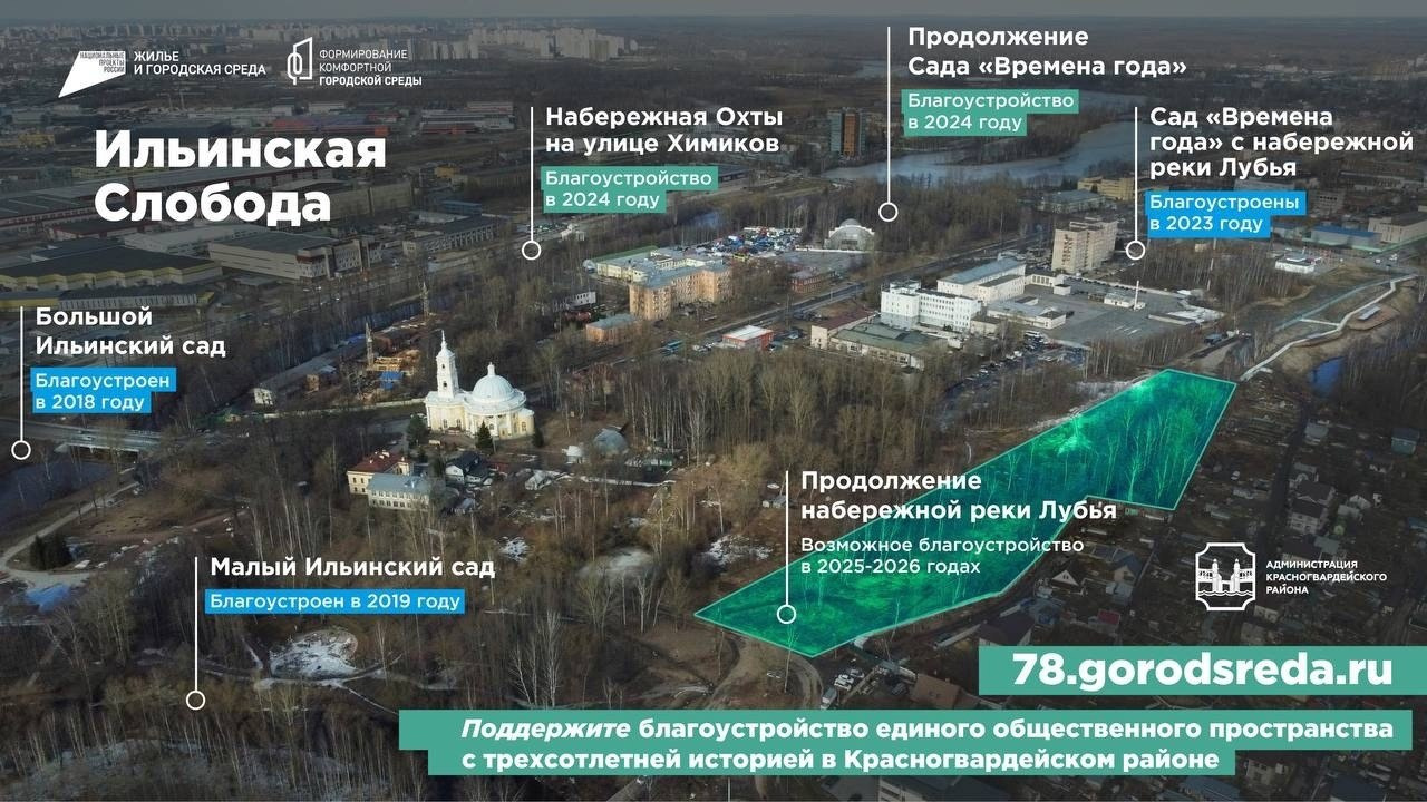 Будущая «Ильинская слобода» объединит в себе Большой Ильинский сад, Малый Ильинский сад, сад «Времена года», набережную Охты на улице Химиков и набережную реки Лубьи. На этой территории расположены Александровские ворота и погреб Охтинского порохового завода — памятники архитектуры, построенные в начале