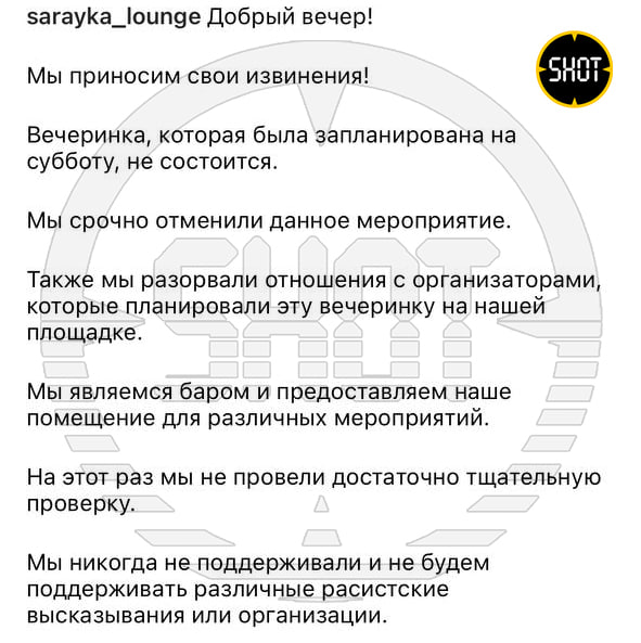 После волны хейта владельцы клуба отменили тусовку за несколько минут до начала. В беседе с SHOT руководство бара сообщило, что было только арендодателем пространства, а также принесло публичные извинения: