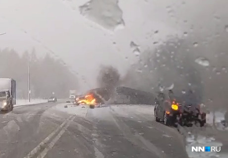 На заснеженной дороге в Арзамасском районе столкнулись фура и «Газель». От удара машина вспыхнула — видео