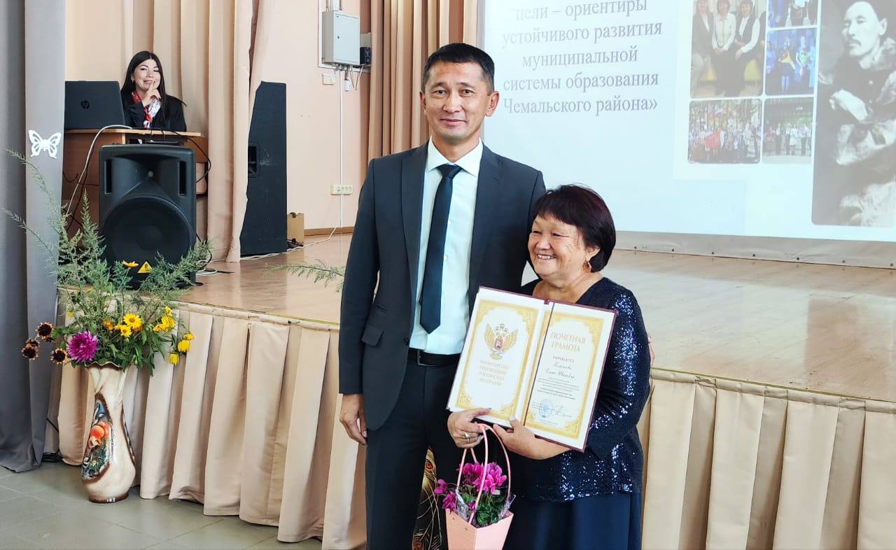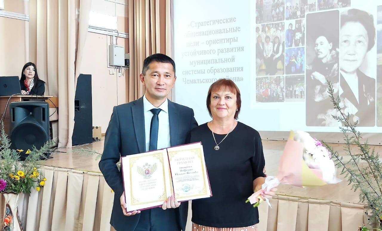 С гордостью за землячек глава района вручил Почётные грамоты Министерства просвещения Российской Федерации воспитателю Эликманарской средней школы Светлане Васильевне Баборыкиной и учителю начальных классов Бешпельтирской средней школы имени Н.Н. Суразаковой Ольге Ивановне Потпоевой.