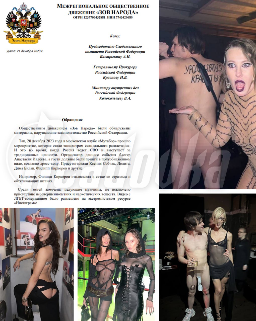 В столичном клубе «Мутабор» этой ночью произошло фактически одноименное зрелище, организованное известной блогершей Ивлеевой. Настюшка-Опасность пошла с козырей — назначила цену за вход на вечеринку ровно в ₽1 млн и дресс-код almost naked — то есть всем быть голыми. Некоторые оголились символически, через просвечивающие а-ля телесные наряды, некоторые исполнили пожелание организаторки буквально. Тошнотворные кадры со сборища с утра гуляют по сети, из вечеринки секрета никто не делал. И пока все обсуждают появление хозяйки бала в колье для ягодиц стоимостью ₽23 млн и недвусмысленные луки субтильных изворотливых юношей с плотоядными глазами, общественная организация «Зов народа» взялась за ручку и бумагу.