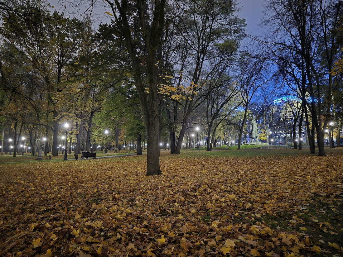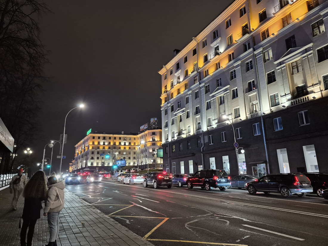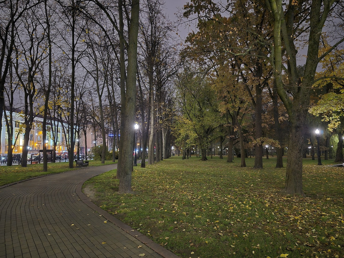 Вечерние фото на основной фотомодуль в целом заслуживают схожего описания. Правда, шумов все же становится больше, а детализация мелких объектов (например, веток деревьев) снижается. Но опять же заметить это можно при сравнении фото с условного S24 Ultra, да и то на большом экране, а не в ленте Instagram. Хорошо, что бликов от источников освещения (скажем, фонарей) практически нет. Этим грешат те же «айфоны».