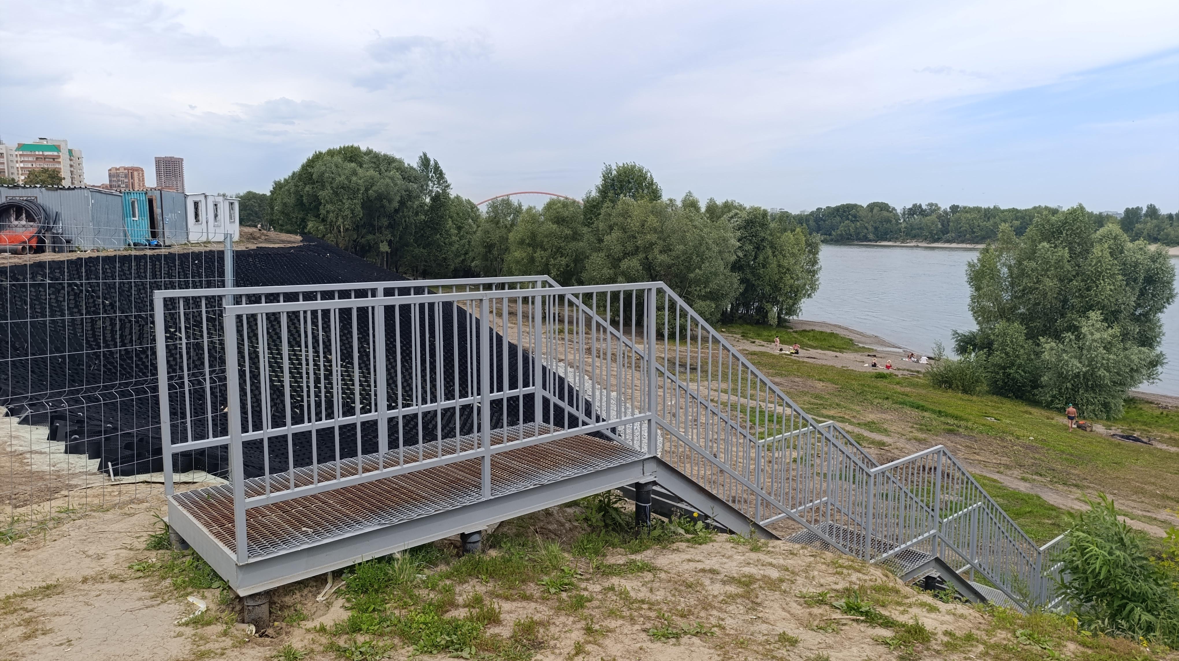 У стройплощадки парка-набережной вдоль улицы Сава Кожевникова появилась достаточно удобная железная лестница, по которой можно спуститься к воде. Ранее НГС писал, что строители начали работы с того, что демонтировали имевшийся там ранее благоустроенный спуск.