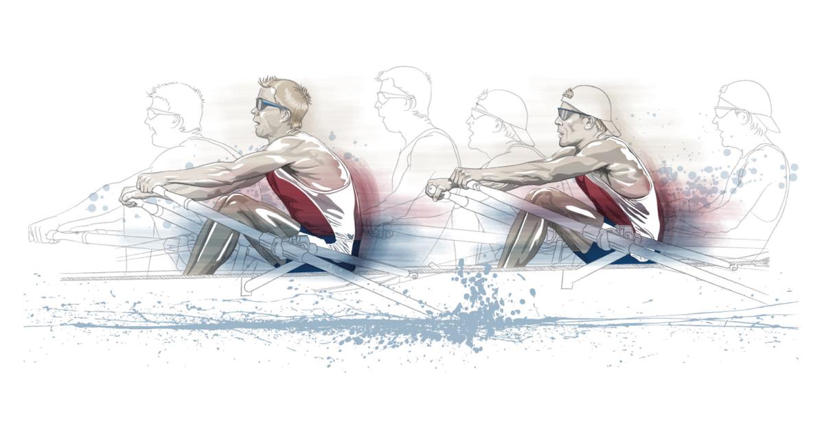 L'aviron consiste en une embarcation propulsée par la force de rames fixées au bateau. Les athlètes sont positionnés dos à la direction de déplacement et passent donc la ligne d'arrivée de dos.