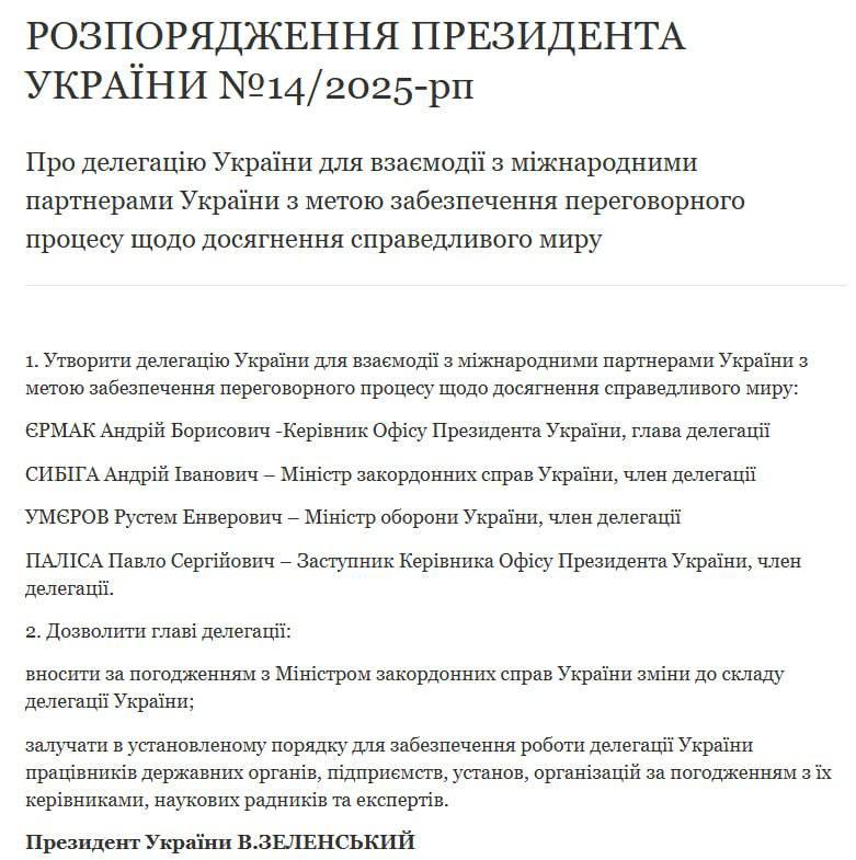 📝Владимир Зеленский официально сформировал украинскую переговорную группу. Согласно распоряжению, в нее вошли: