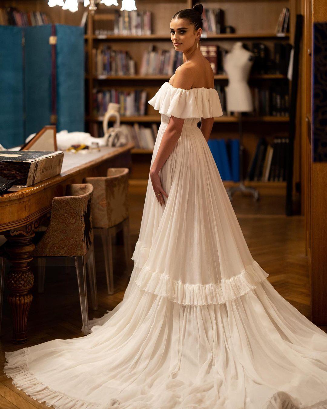 Vogue связался с Тейлор во время последней примерки ее свадебного платья на Манхэттене с креативным директором итальянского Дома Etro Макро де Винченцо (он же был креативным директором Fendi). «Это на самом деле первое свадебное платье, которое когда-либо шили Etro!» — делится Тейлор. Модель работала с этим брендом почти десять лет, поэтому долго над тем, кто будет шить ее платье, она не раздумывала. «Когда мне прислали наброски платья, я подумала: «Вы как будто побывали у меня в голове. Моя любимая часть платья — это, наверное, верх, открывающий плечи. Эти оборки придают образу романтичности, которую я искала». Длинное платье без рукавов и со свободной юбкой из нескольких ярусов завершает длинная фата.