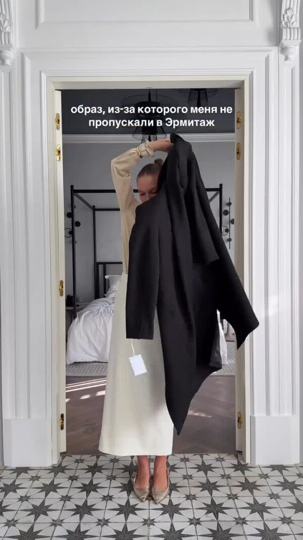 В Эрмитаж блогерша пришла в длинной белой юбке, бежевой кофте и в черном пальто. Все это она дополнила серебряными туфлями на низком каблуке и бижутерией. Ради справедливости нужно сказать, что в нынешнее время для многих девушек это действительно повседневный стиль.
