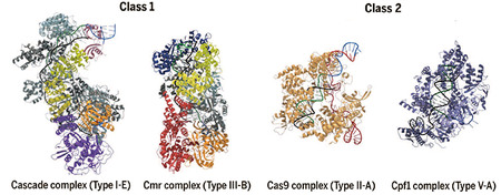 Классы систем CRISPR/Cas подразделяются на несколько типов. К классу 1 относятся типы I, III и IV, а к классу 2 — типы II, V и VI. Деление на типы основано на устройстве эффекторных комплексов, причем в системах одного и того же типа, как правило, в состав комплекса входит особый сигнатурный белок, уникальный для систем этого типа. Типы, в свою очередь, делятся на подтипы, различающиеся особенностями строения локуса CRISPR и, в некоторых случаях, наличием уникальных белков Cas (рис. 2) [3].