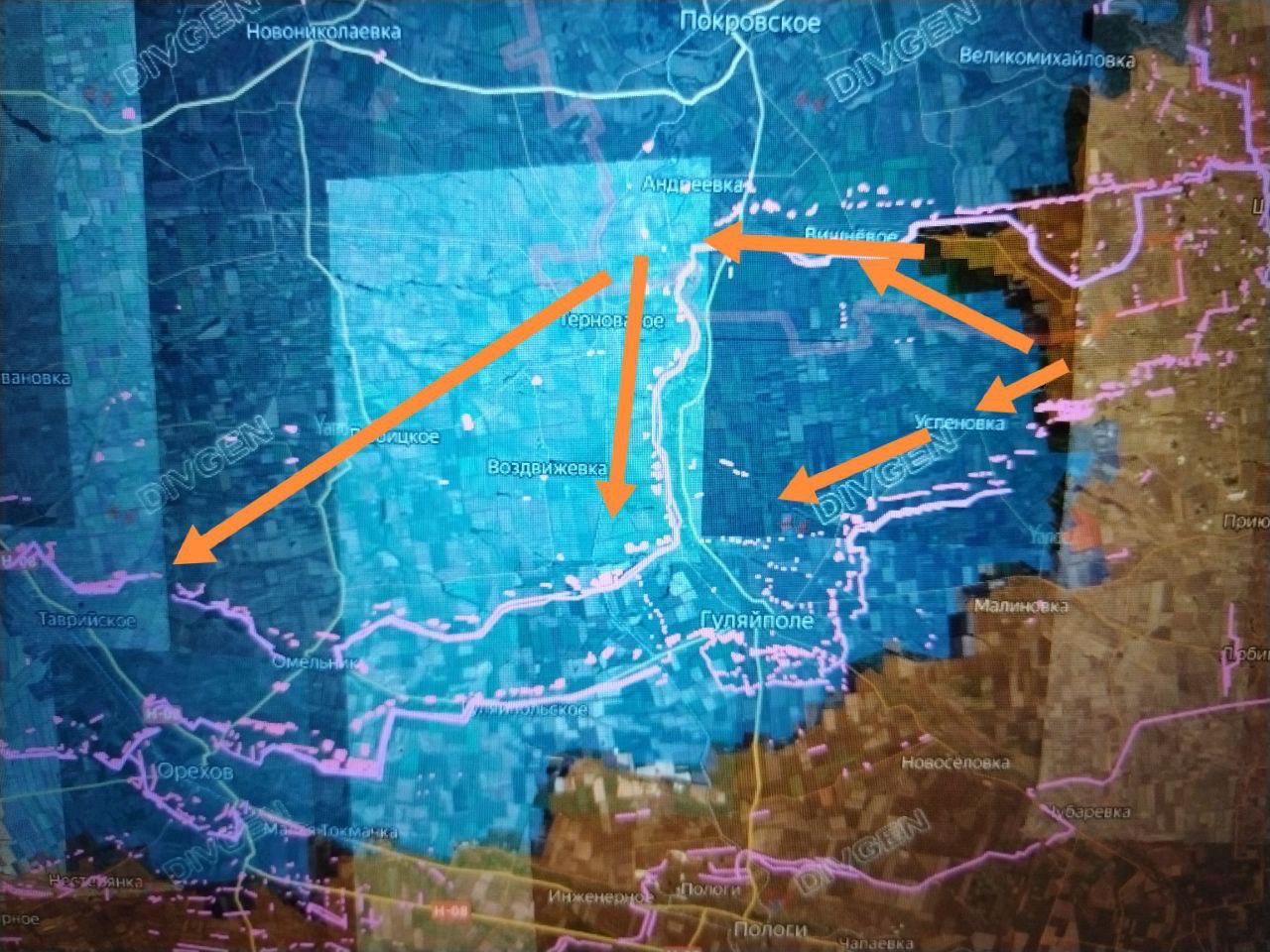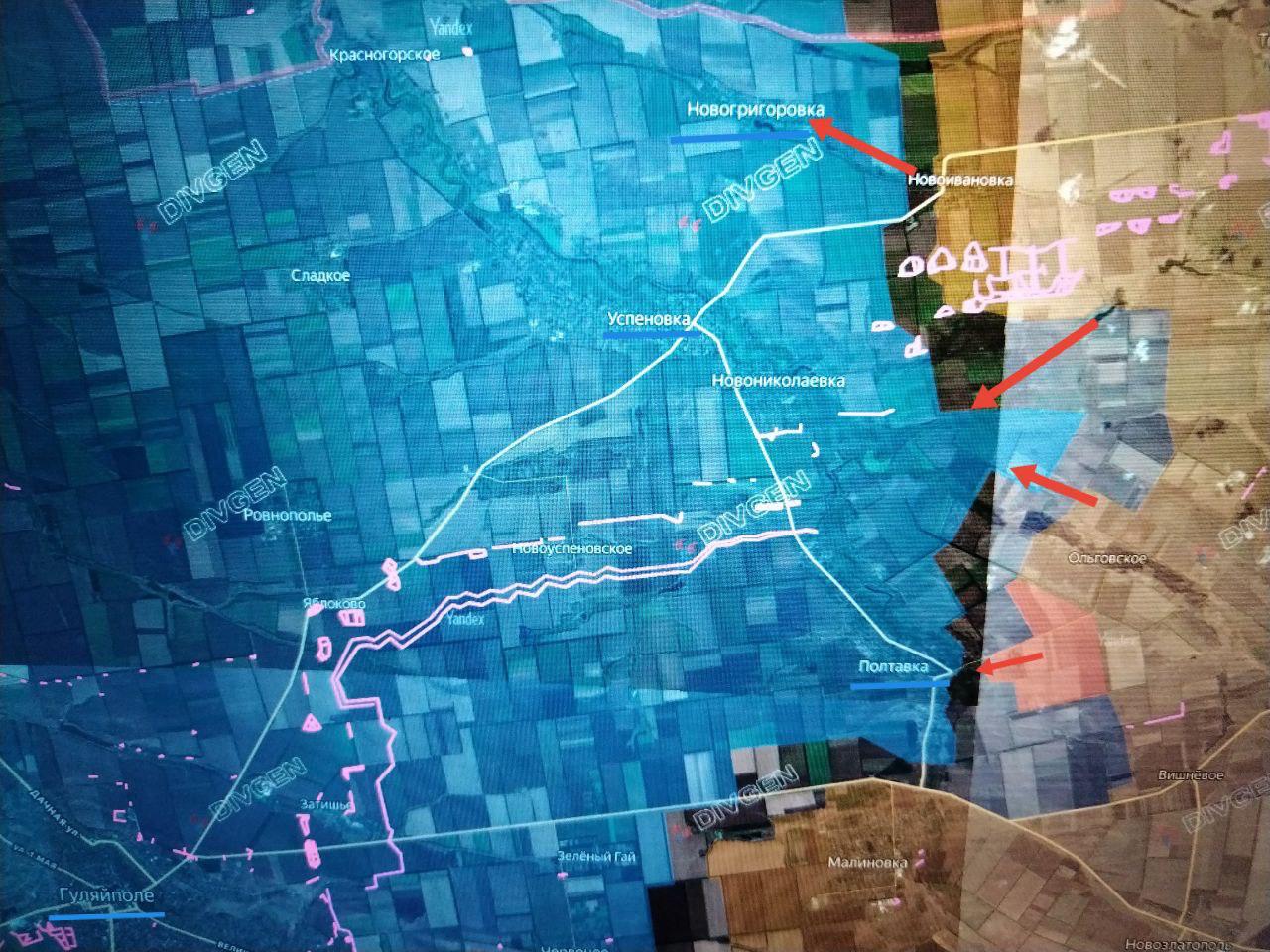 Севернее наши подразделения ведут бои за Новогригоровку. Взятие последней необходимо для обеспечения фланга/тыла штурмовых подразделений, которые будут штурмовать Успеновку, расположенную в 15 км северо-восточнее Гуляйполя.
