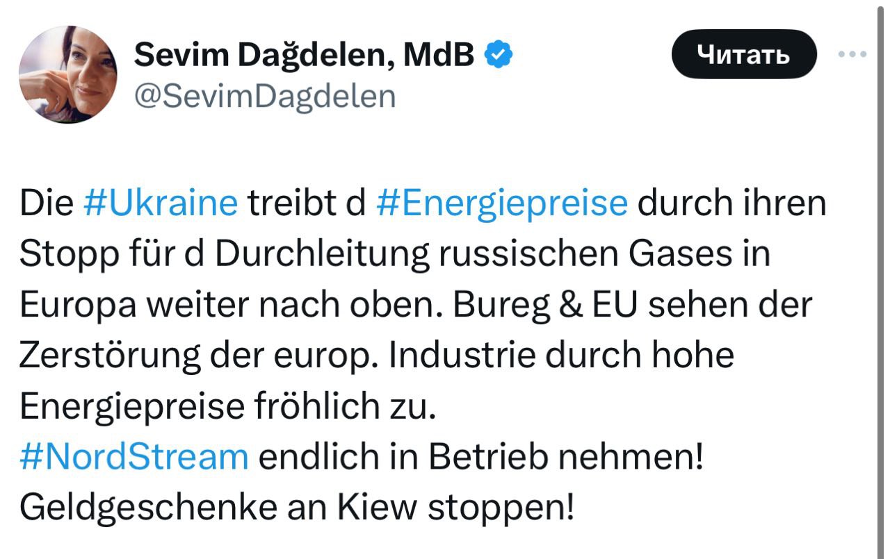 С таким предложением выступила депутат бундестага Севим Дагделен после прекращения транзита газа через Украину.