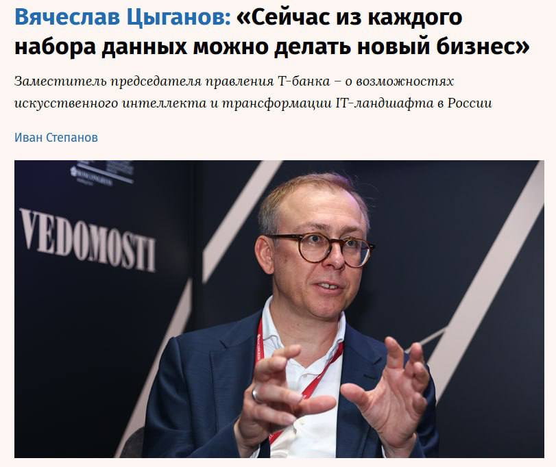 Зампред правления Т-Банка Вячеслав Цыганов в интервью «Ведомостям» назвал данные стратегическим активом. По его словам, искусственный интеллект радикально трансформировал модель бизнеса, а собственные ИИ-сервисы стали обязательным условием для развития.