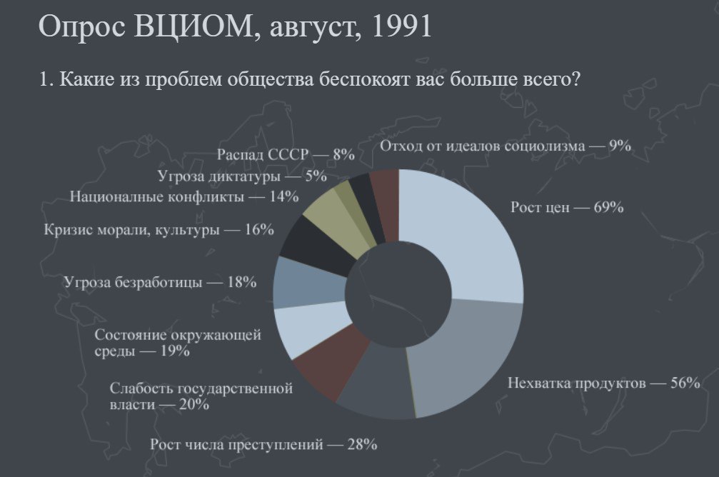 А волновал людей дефицит ВСЕГО – в первую очередь еды, а также рост цен. Люди думали только о выживании. Если бы Ельцин в то время предложил и Россию распустить на 20-30 новых государств в обмен на еду и элементарные средства быта, то, уверен, и этот шаг советские люди восприняли бы с большим одобрением.