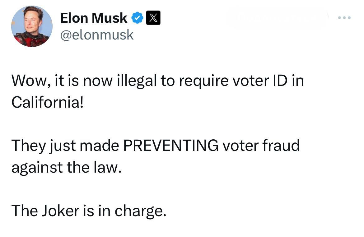 Илон Маск рассказал, что власти Калифорнии приняли закон, который запрещает на выборах президента требовать удостоверение личности избирателя. Поэтому голосуют кто попало и массовый завоз демократами мигрантов очень кстати.