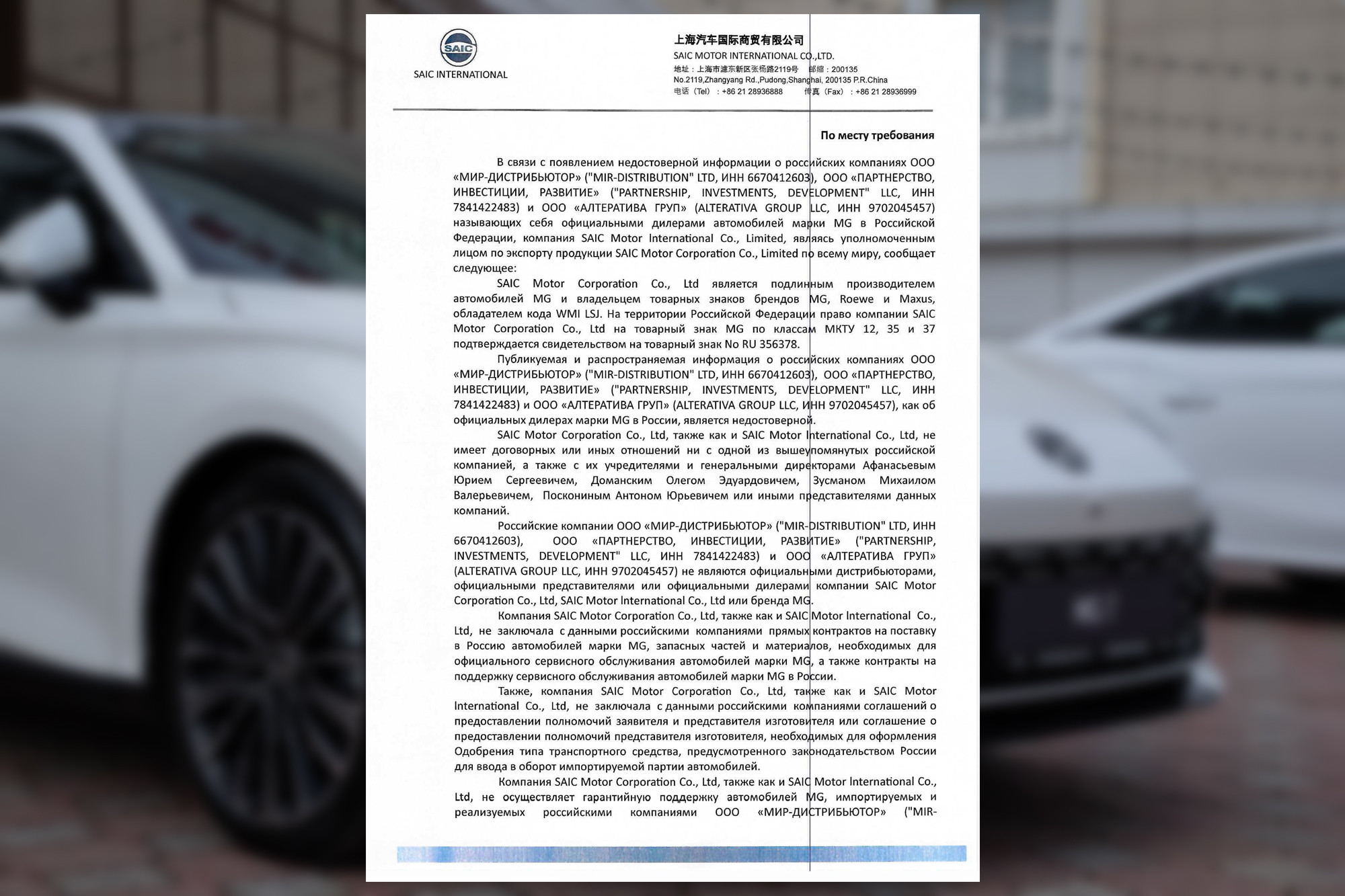 ООО "МИР-ДИСТРИБЬЮТОР", ООО "ПАРТНЕРСТВО, ИНВЕСТИЦИИ, РАЗВИТИЕ" и ООО "АЛТЕРАТИВА ГРУП" не являются официальными дистрибьюторами, официальными представителями или официальными дилерами SAIC Motor Corporation Co., Ltd, SAIC Motor International Co., Ltd, или бренда МG… Компания SAIC Motor Corporation Co., Ltd, так же, как и SAIC Motor International Co., Ltd, не заключала с данными российскими компаниями прямых контрактов на поставку в Россию автомобилей марки МG, запасных частей и материалов, необходимых для официального сервисного обслуживания автомобилей марки МG, а также контракты на поддержку сервисного обслуживания автомобилей марки МG в России».