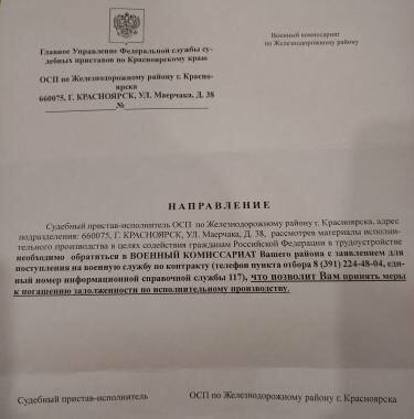 В службе судебных приставов заявили, что не присылали жительнице Красноярска направление в военкомат. В сообщении ГУФССП по Красноярскому краю говорится, что служба не имеет к этому отношения, а пришедший красноярке документ может быть делом рук коллекторов или банка-кредитора.