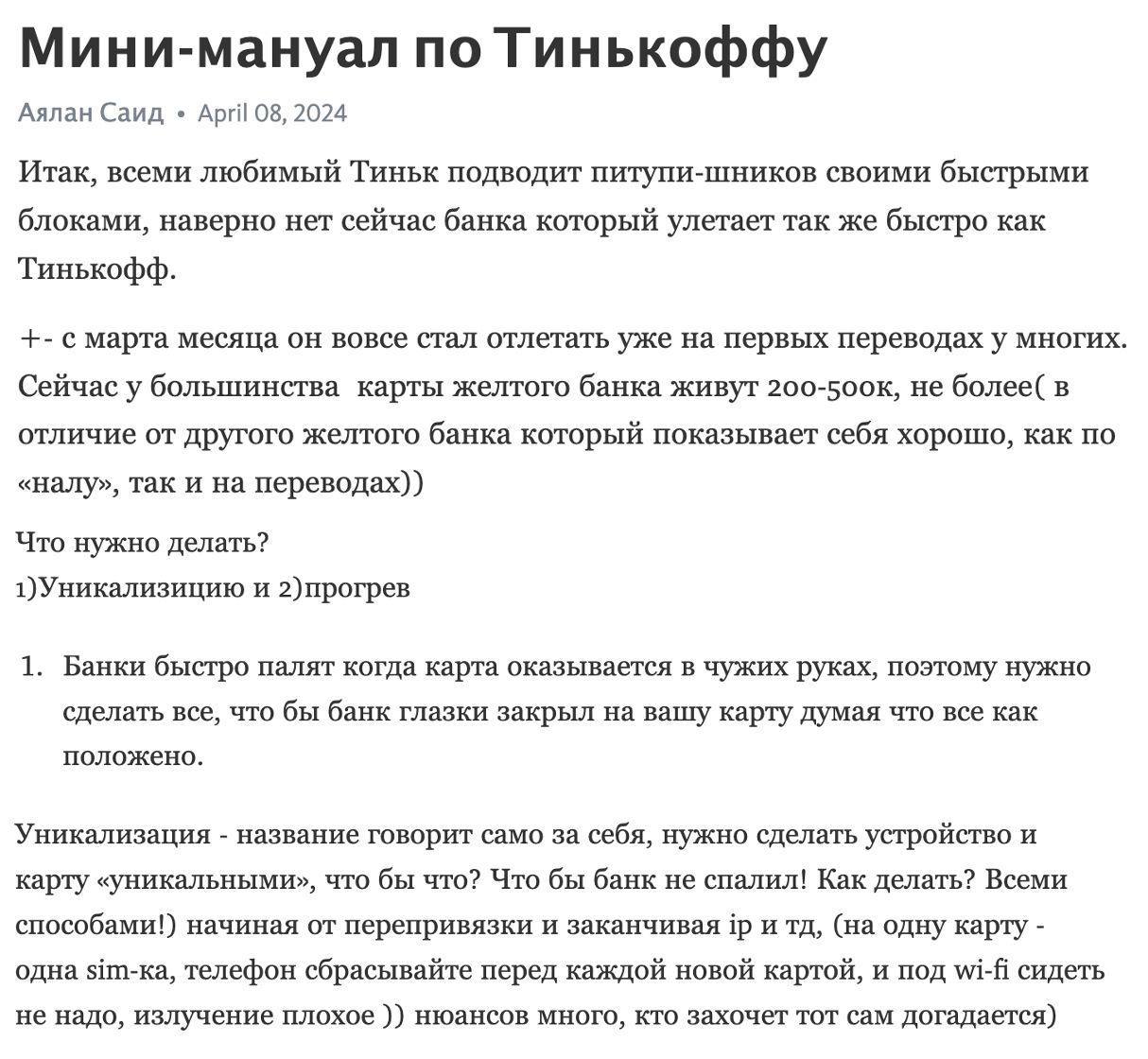 Уже сейчас в банке говорят о двукратном сокращении количества счетов клиентов, пытающихся получить средства обманным путем, и о сокращении потерь в 2,5 раза. На картинке можно увидеть инструкцию, которую разработали мошенники и которая позволяет хоть как-то обходить систему Тинькофф, но даже ее авторы признают, что с желтым банком стало работать сложно.