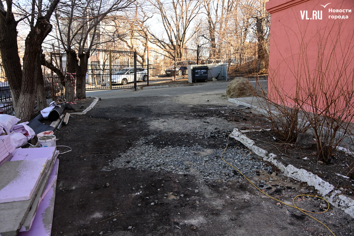У школы № 26 на Амурской, 14, судя по состоянию асфальта, пешеходные зоны ремонтировали очень давно. Всюду – мелкие и крупные трещины и многочисленные ямы, в том числе и довольно глубокие. С одной из сторон асфальта и вовсе нет, по всей видимости его смыло после дождей. Ливнёвок вокруг не видно, а проблемный участок без асфальта находится на довольно крутом пригорке. Сейчас здесь ремонтируют фасад школы (она была основана в 1935 году и до сих пор располагается в типичной «сталинке» тех лет). Школе, как и всем остальным, дадут до 3 млн рублей на то, чтобы заменить старый асфальт и бордюры на новые, ливнёвок в проекте нет – а без них это всё разрушится быстрее, вместо этого в списке дел – озеленение территории.