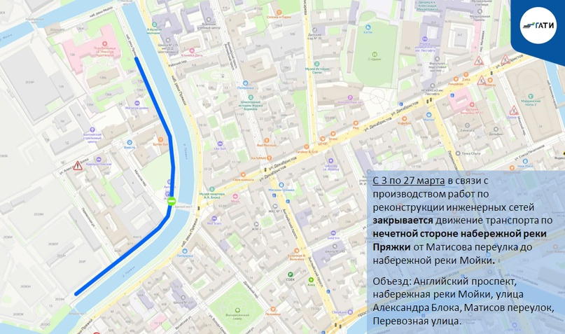 С 3 по 27 марта для реконструкции инженерных сетей перекроют движение по нечетной стороне набережной Пряжки от Матисова переулка до набережной реки Мойки. Объехать участок можно будет по Английскому проспекту, набережной Мойки, улице Александра Блока, Матисову переулку и Перевозной улице.