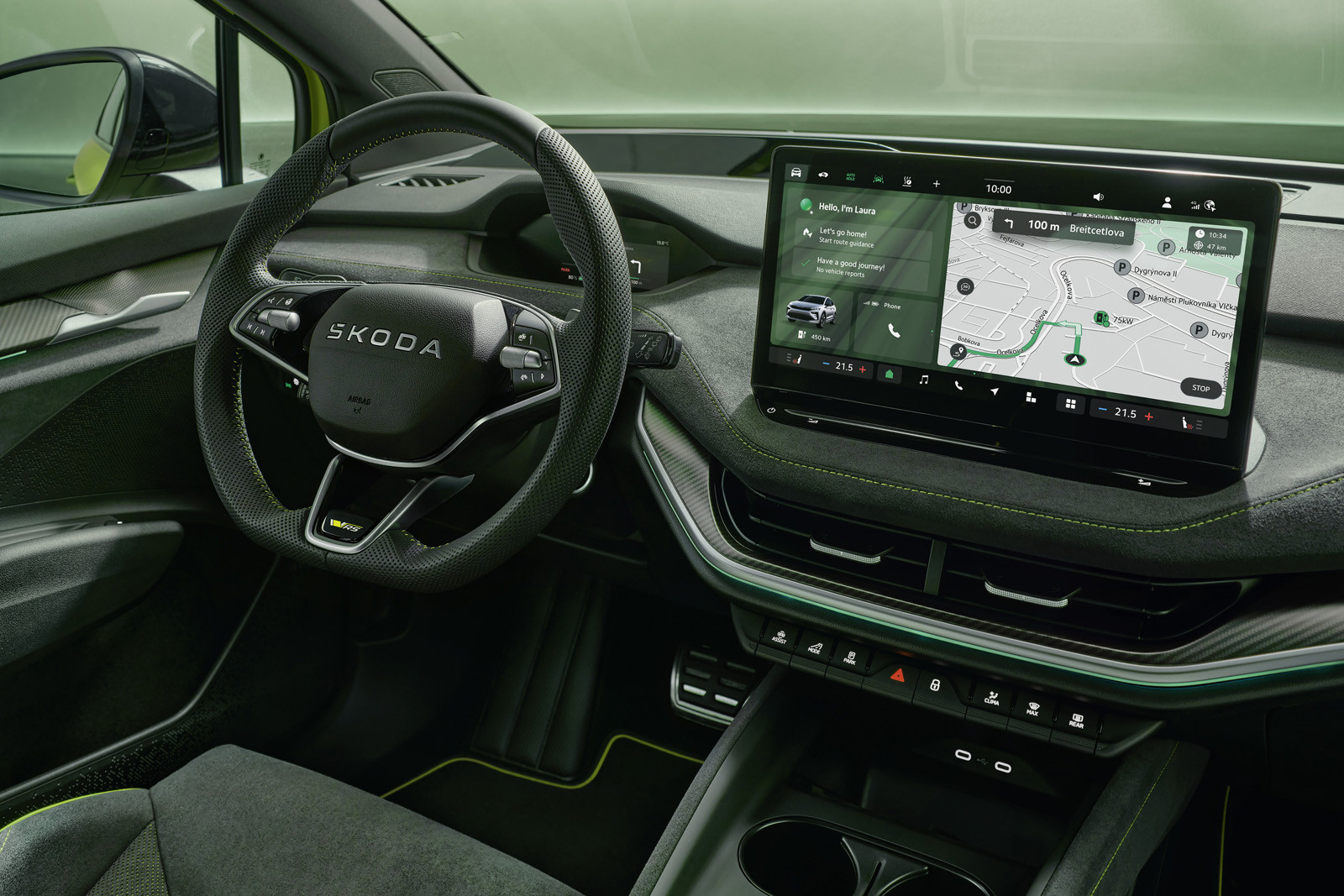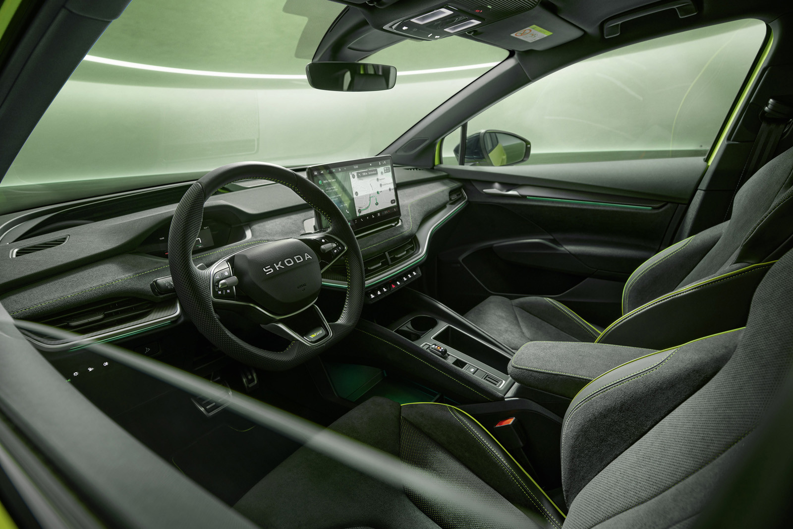 Интерьер рестайлинговых Enyaq RS и Enyaq Coupe RS может иметь два варианта оформления – Lounge и Suite (предполагает комбинированную отделку из кожи и искусственной кожи с серой прострочкой, а также декоративные элементы «под углеволокно»). В первом ряду установлены спортивные кресла. На передней панели, как и у стандартных Enyaq, размещены пятидюймовая виртуальная приборка и центральный тачскрин информационно-развлекательной системы диагональю 13-дюймов.