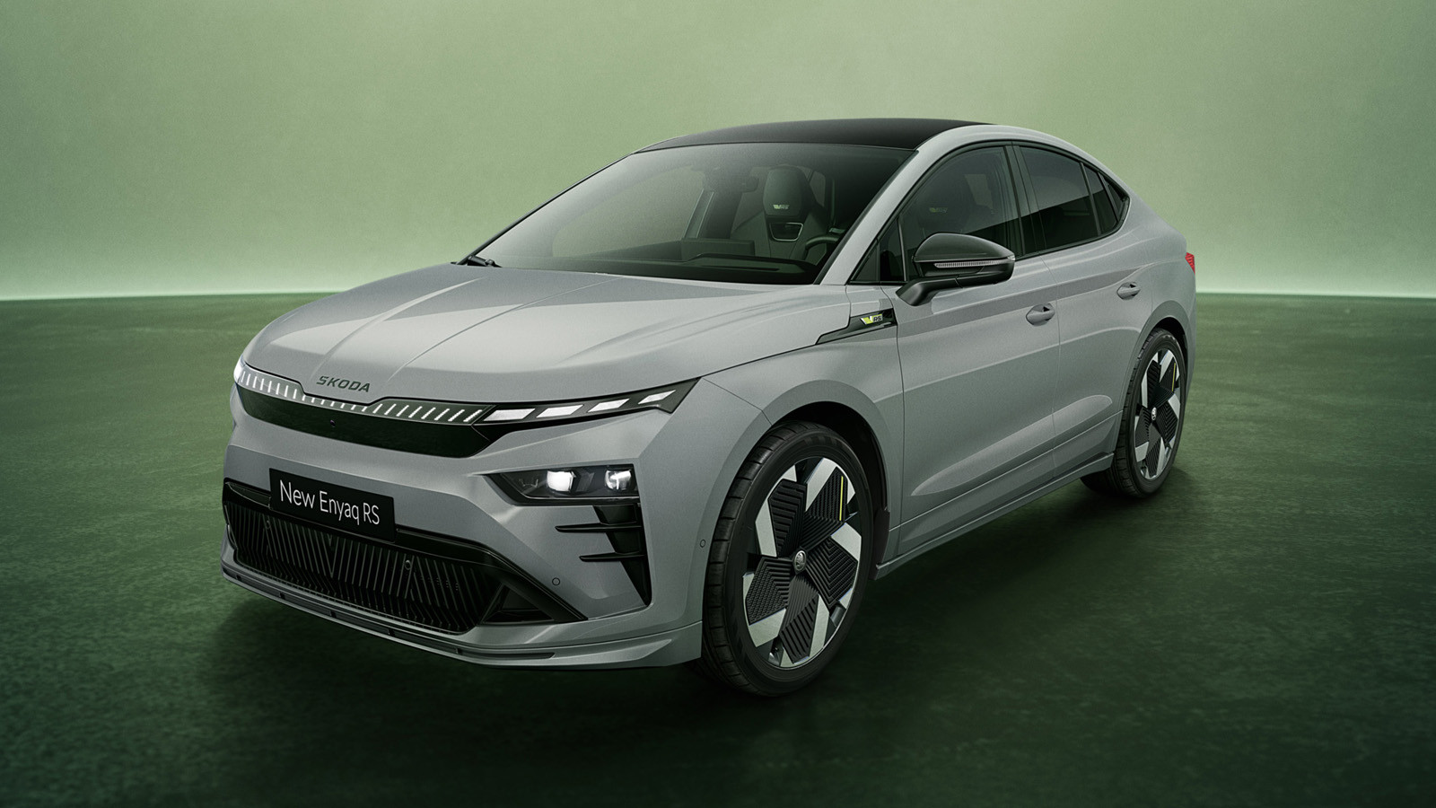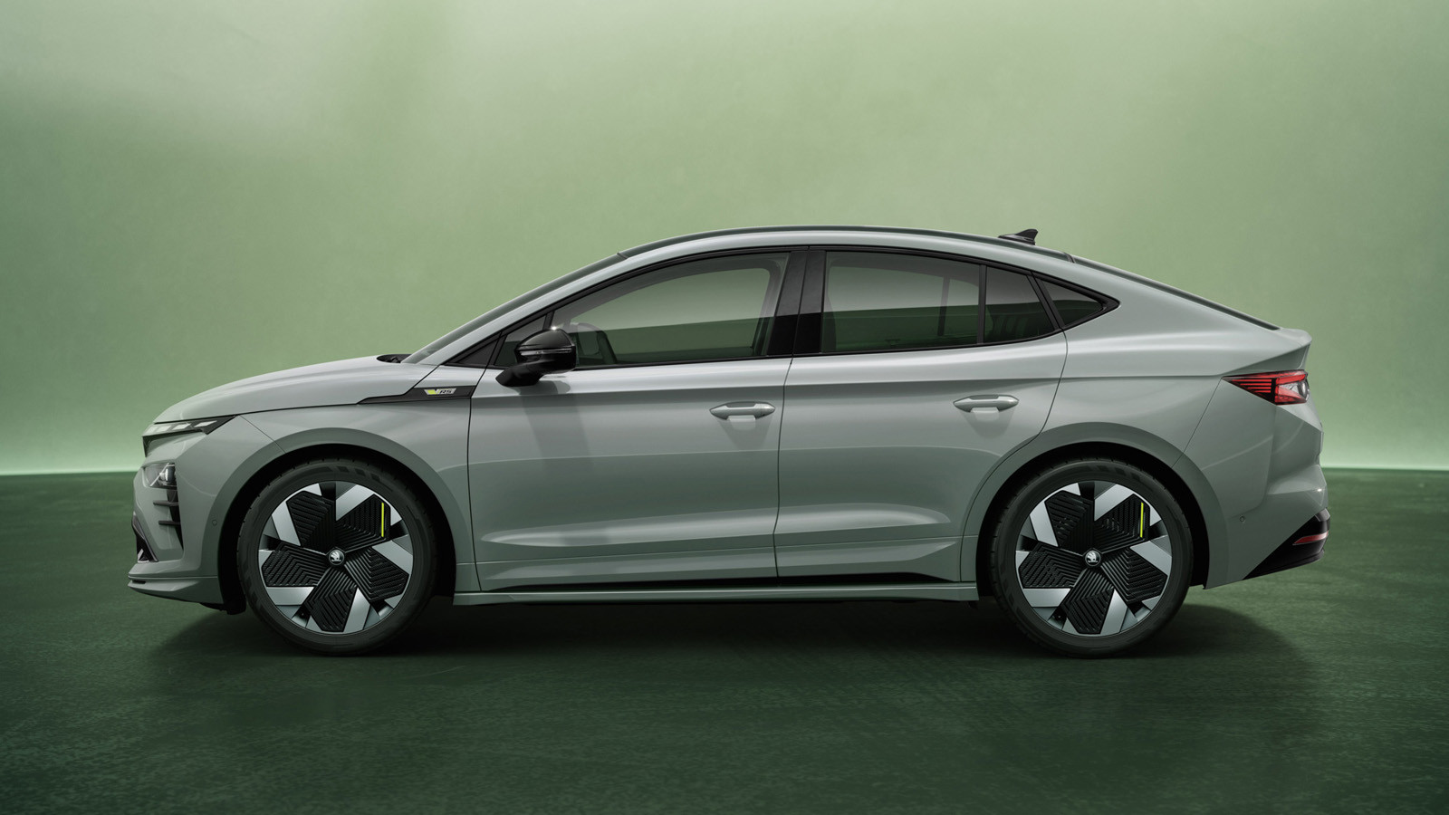 В нижнюю часть переднего бампера интегрирован довольно большой воздухозаборник с необычным рисунком, ниже можно увидеть сплиттер. На боковинах у обновлённых Skoda Enyaq RS и Enyaq Coupe RS имеется шильдик с названием версии, чёрные корпуса наружных зеркал, обычные дверные ручки, окрашенные в цвет кузова, оригинальные колёсные диски (стандартные 20-дюймовые, за доплату доступны 21 дюймовые). У кроссовера с традиционным кузовом на крыше можно увидеть чёрные рейлинги, у кросс-купе чёрным цветом отделан верх.