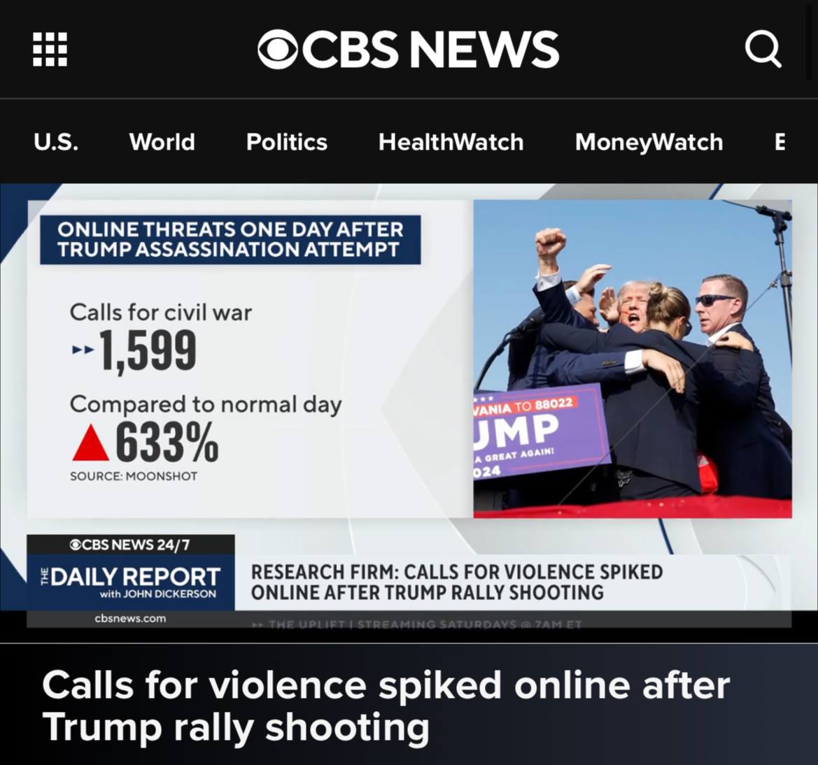 Покушение на Трампа привело к более чем семикратному увеличению онлайн-призывов к началу гражданских восстаний в Америке, сообщает CBS News.