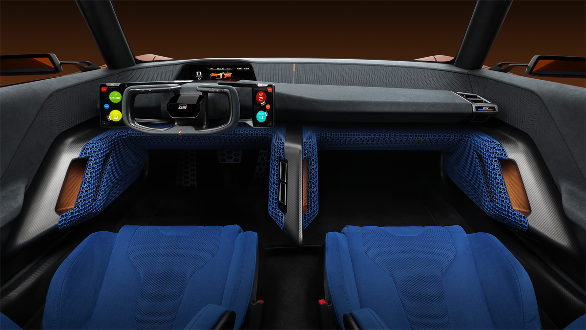 У концепта двухместного купе интерьер футуристичен за счёт внутренней отделки дверей, нижней части передней панели и центральной консоли – она выполнена из пластикового плетения насыщенного синего цвета. Шоу-кар снабдили креслами-ковшами Recaro со спинками из углеволокна, отделанными синей алькантарой. Привычное рулевое колесо заменено на штурвал, вокруг находятся три отдельных дисплея, центральнй исполняет роль виртуальной приборки. Очевидно салон серийного спорткара будет оформлен в более традиционном стиле.