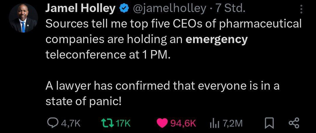 "Источники сообщили мне, что пять крупнейших руководителей фармацевтических компаний проведут экстренную телеконференцию в 13:00.