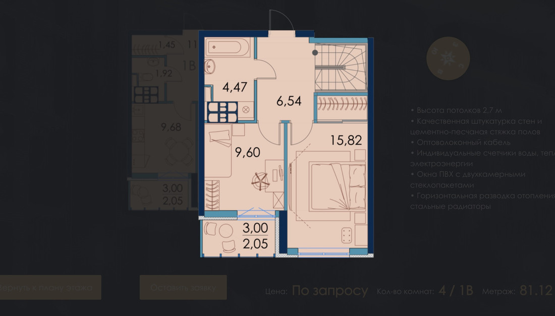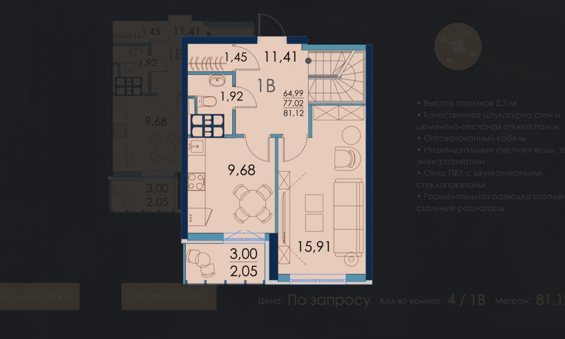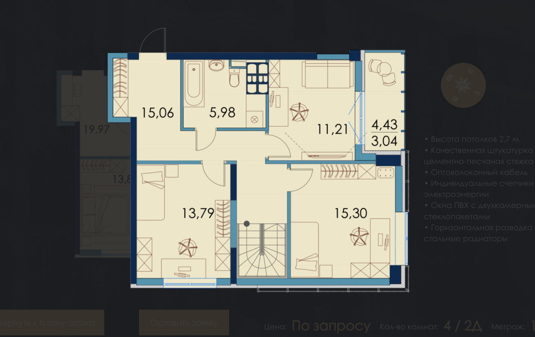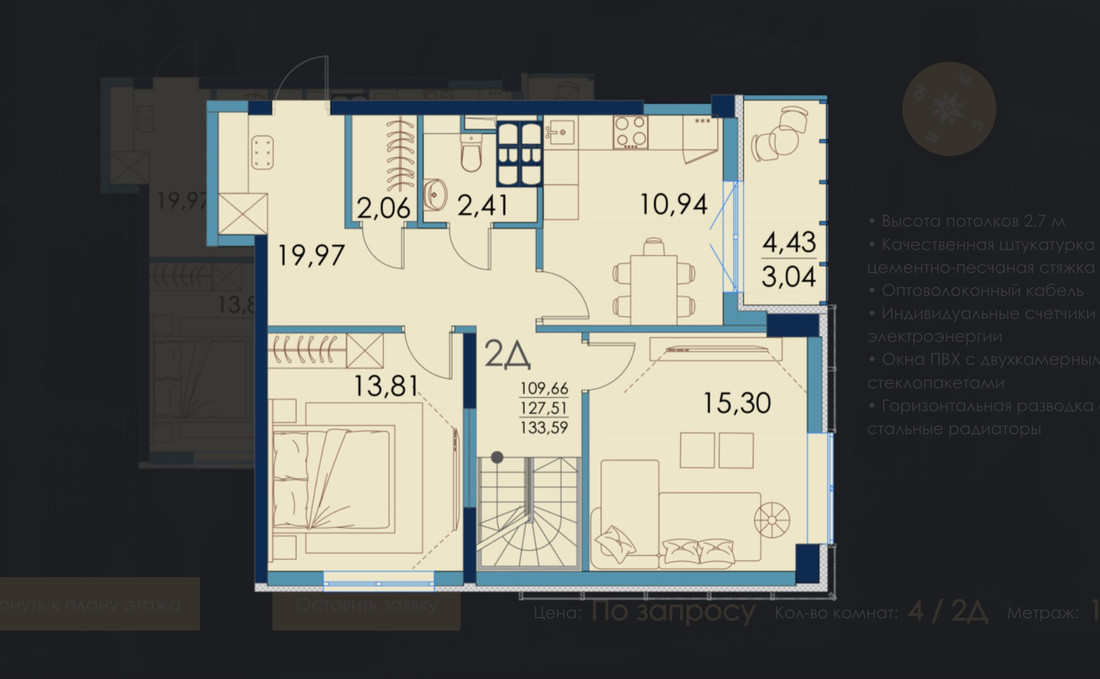 Общий метраж у таких квартир довольно солидный: 80—134 «квадрата». Стоимость метра колеблется от 4125 до 4600 рублей при стопроцентной оплате (примерно $1290 и $1440 по курсу соответственно). Всего предлагают девять двухуровневых квартир.
