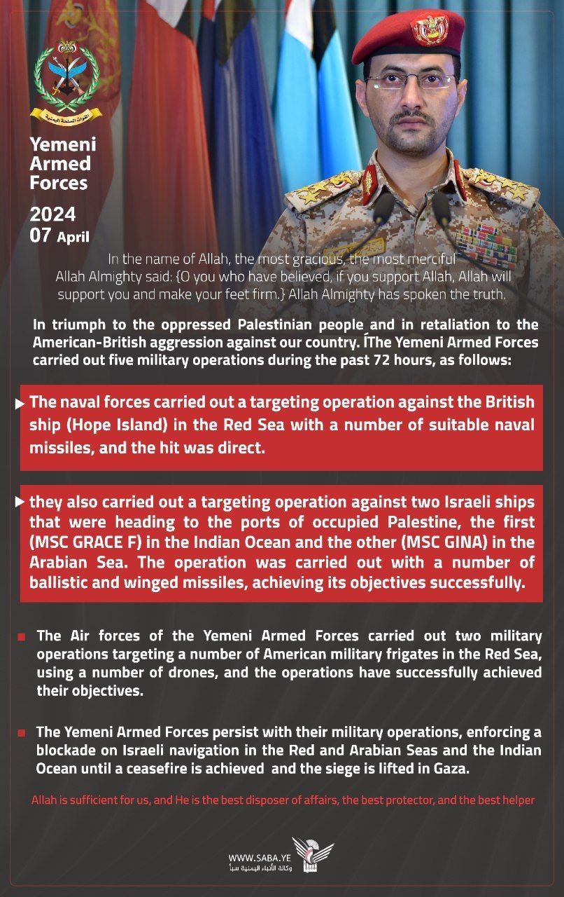 ❗️ВС Йемена заявили об успешных ударах по британскому судну Hope Island и израильским судам MSC Grace F и MSC Gina