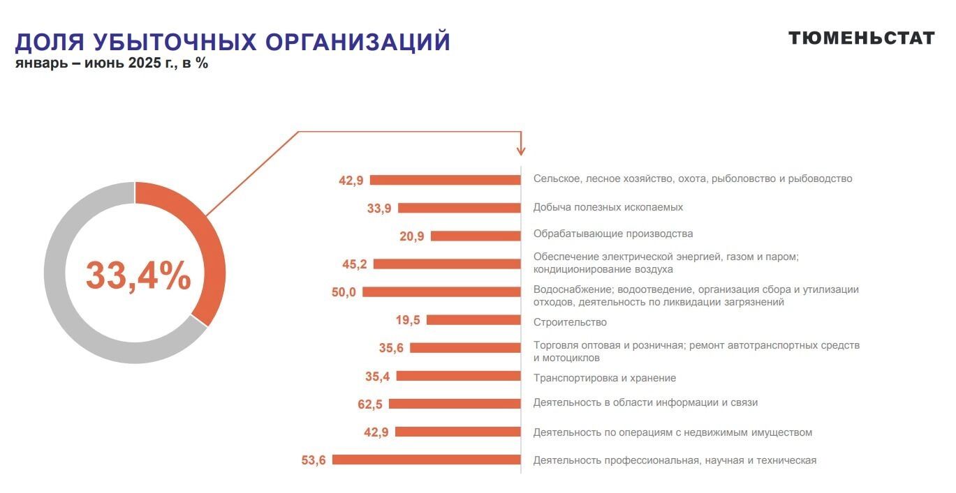 Тюменьстат по итогам первого полугодия фиксирует сокращение доли прибыльных организаций в ХМАО — с 67,3% до 66,6%. Среди сфер экономики, где доля убыточных компаний наиболее высокая, лидируют организации занимающиеся деятельностью в области информации и связи. На них приходится 62,5% убыточных организации.