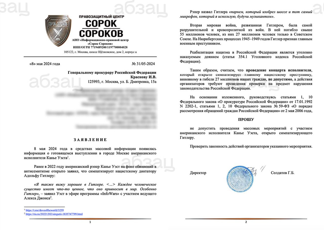 Общественники обратили внимание на этот факт и подчеркнули, что подобному деятелю нет места в РФ. Кроме того, они обратили внимание на факт нарушения закона Российской Федерации американским артистом. Текст обращения оказался в распоряжении «Абзаца»: