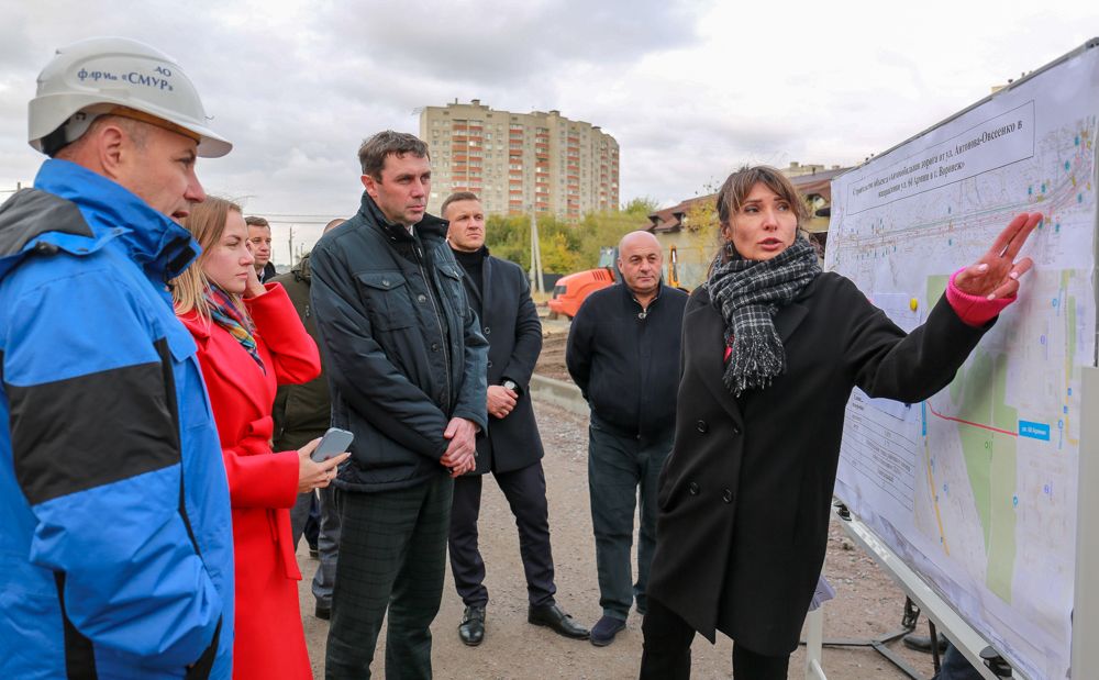 В начале выездного совещания по случаю наступающего Дня работников дорожного хозяйства мэр поздравил руководителя Городской дирекции дорожного хозяйства и благоустройства Оксану Евдакову и сотрудников возглавляемого ей учреждения. Оно выступает заказчиком на объектах, является первой инстанцией, которая регулирует возникающие сложности, осуществляет прямой ежедневный контроль за работами, в том числе на дублёре Московского проспекта и Остужевской развязке.