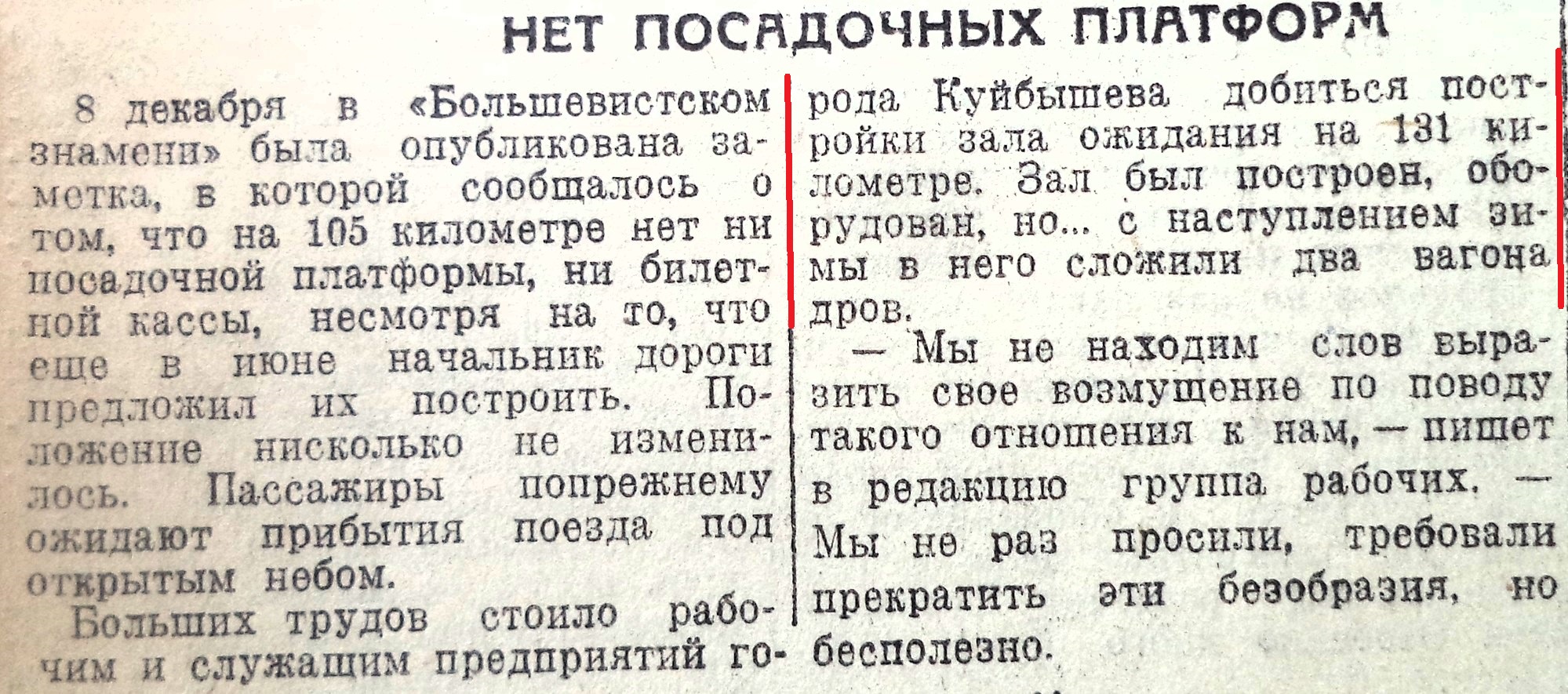 Так, в газете «Куйбышевский железнодорожник» от 1 ноября 1958 года читаем: «Станция Красный Кряжок существует десятки лет, а пассажирскую платформу здесь до сих пор не построили. Это очень неудобно для пассажиров, особенно после того, как была произведена подъемка нечетного станционного пути».