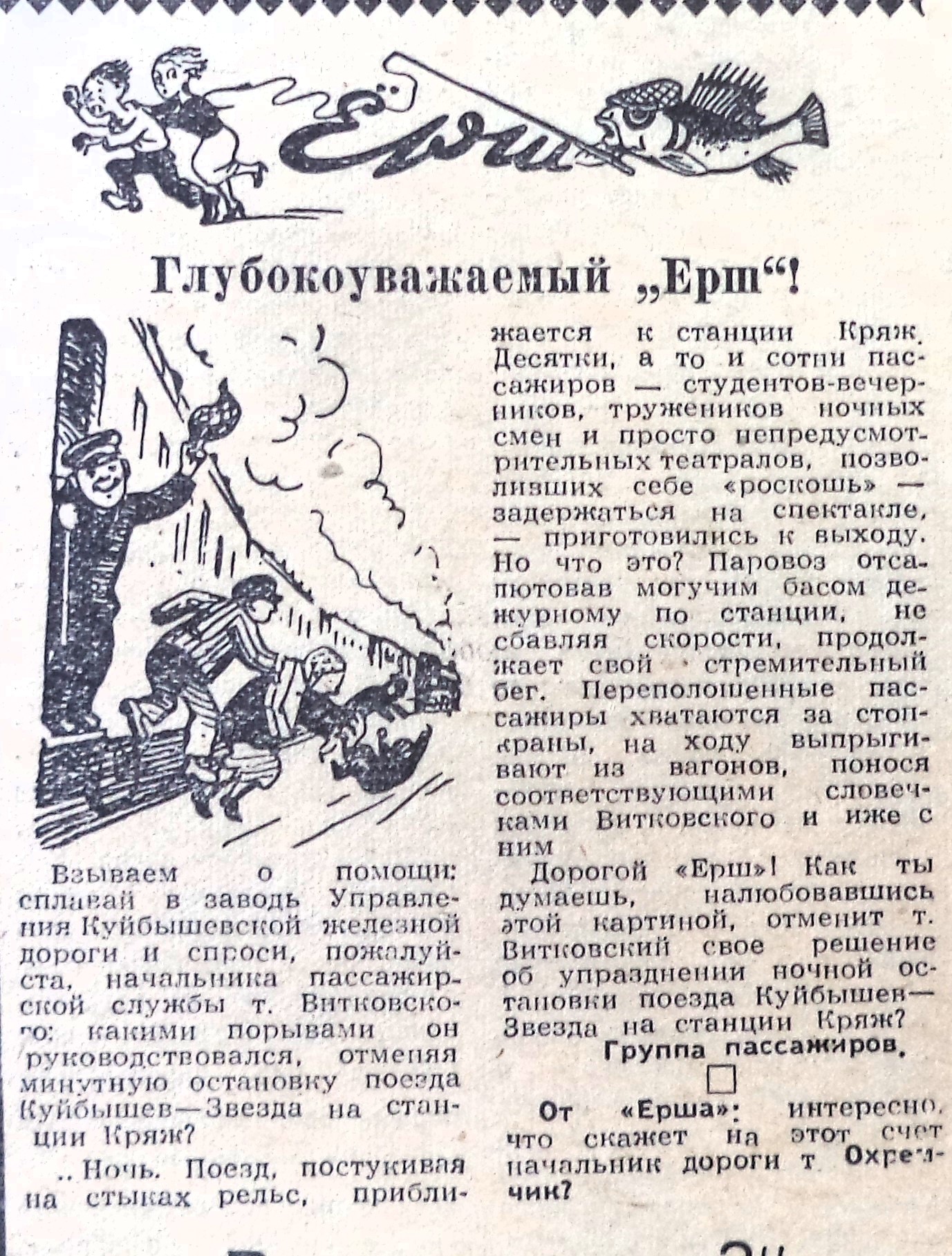 Из газетных заметок, посвященных станции Кряж, приведем опубликованную в «Волжском комсомольце» в октябре 1956 года.