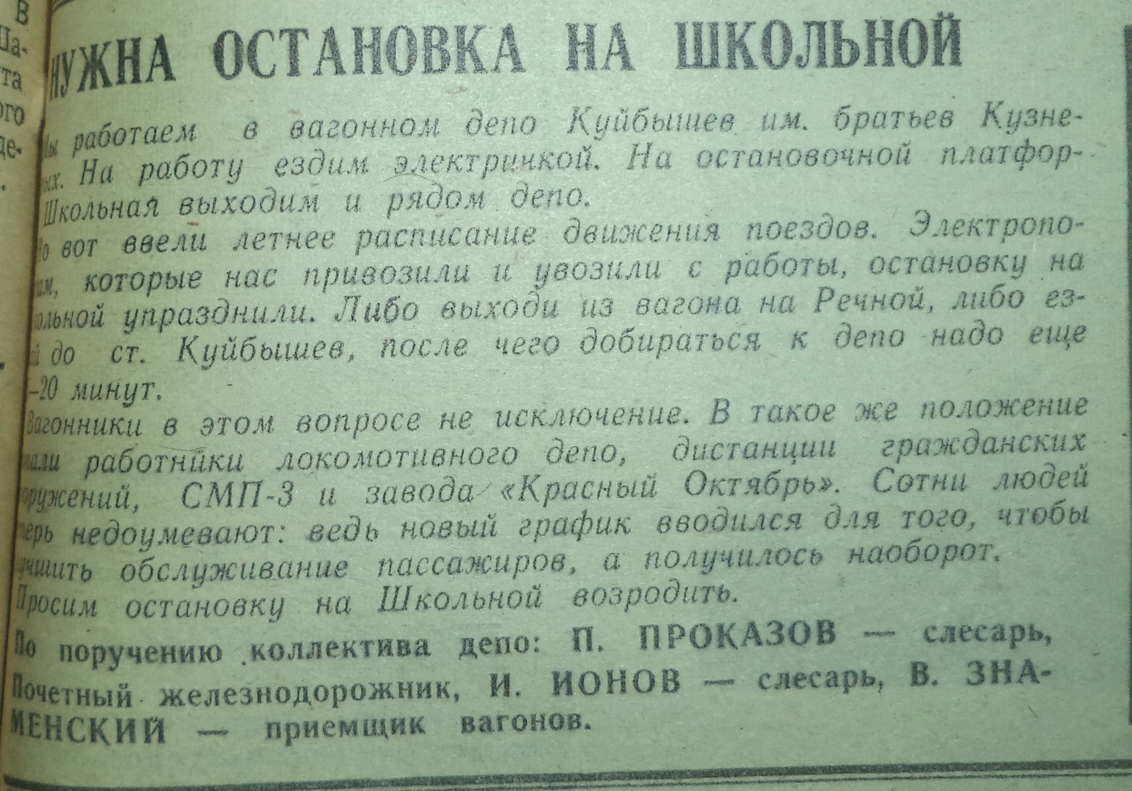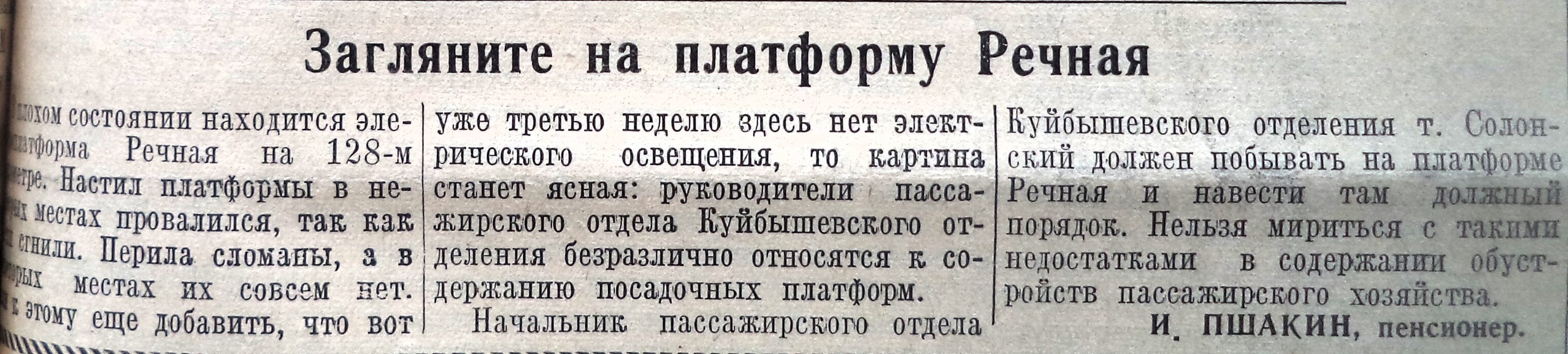 Вообще, судя по газетным заметкам, платформа Речная всегда была местом проблемным. Вот, например, одна из них, из газеты «Куйбышевский железнодорожник» от 28 апреля 1959 года.